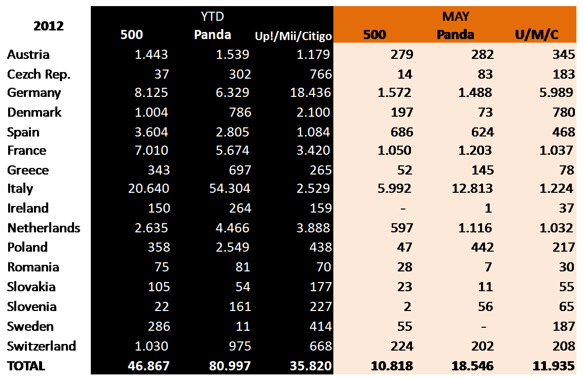 The first thing that must be considered is that UK sales figures were not included in the analysis as there is only data for 10 best selling cars. The lack of UK results affects considerably Fiat 500 as it was the tenth best selling car in that country during May/12 with 2.823 units. So the countries to be analyzed were the same of April’s analysis: Austria, Czech Reublic, Denmark, Germany, Spain, France, Greece, Italy, Ireland, Netherlands, Poland, Romania, Slovakia, Slovenia, Sweden and Switzerland, or in other words, those European markets with available data. In May/12 the trio Up!/Citigo/Mii sold more than Fiat 500! it is the first time the small VW have better results than the popular 500. The Germans sold 11.935 units, up 44%, against 10.818 Fiat 500, up 23%. Unlike what one would think, the difference is explained by what happened in smallest markets because both models sold pretty much the same in their native countries: 6.000 units in Germany and in Italy, and vice versa, 1.224 units of VW sold in Italy and 1.572 of 500 sold in Germany. In France they both sold more or less the same, around 1.050 units. But the big differences come from Netherlands and Denmark where the VW Up! has become really popular. In the rest of small markets people are shifting from Fiat to VW. But the analysis must be also done taking into account Fiat Panda figures.