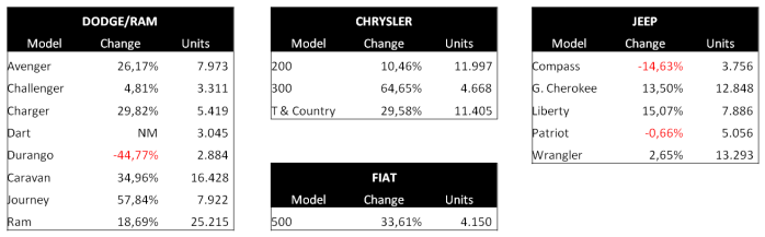 The Ram is up 19% while the Caravan had a great performance, up 35%. Among Dodge models the new Dart took off with more than 3 thousand units, which is far from the target but is a result that Marchionne liked. The Journey had the best performance, up a massive 58%. The Chrysler 200 slowed down but the 300 grew up 65%. The Jeep Grand Cherokee seems to reach its top with almost 13.000 units sold. Now Chrysler needs more fresh products and new midsize SUV if it wants to keep its good performance.