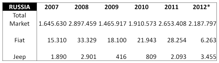 Sales figures for Russian market, and Fiat and Jeep brands. In a very unstable market, Fiat seems to lose a big market share while Jeep continues to sell more and more. 2012 data for January-September period. Source: Autoblog Español, http://www.carsitaly.net