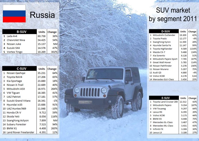 Last year more than 600.000 SUV were sold in Russia, 25% of total sales. From them almost 45% correspond to mid-sized SUV (C), though the best-selling model belongs to B-SUV Segment. Those numbers, and sales growth most of SUV had in 2011 compared to 2010, tells how important that segment is in Europe’s second largest market. Source: bestsellingcarsblog.net