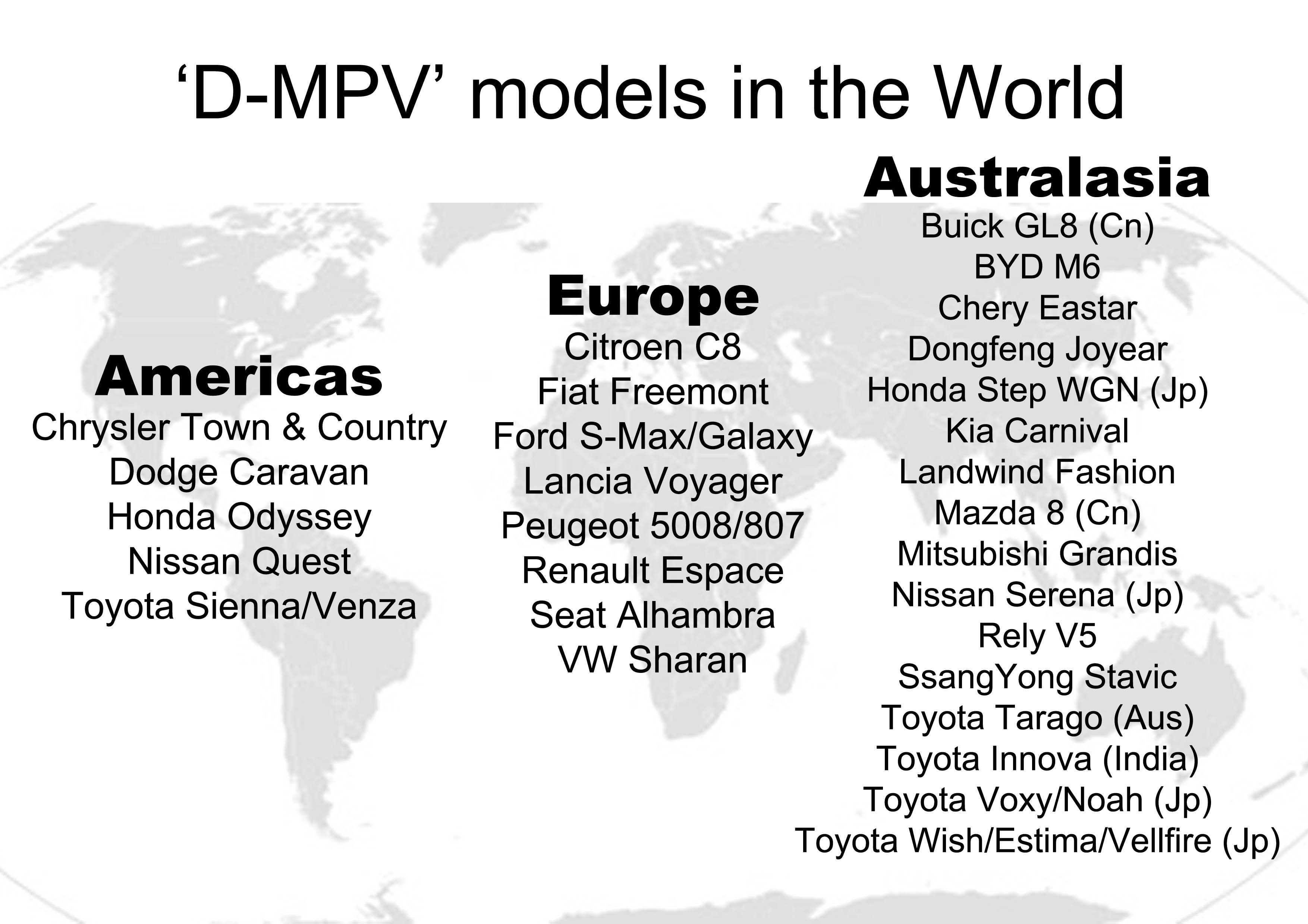 The last kind of minivans are the largest ones, called ‘D-MPV’. There are plenty of kinds as they are very popular in USA and Europe loves them too. They are mostly not based on regular passenger cars, as B or C-MPV, but they are created as real minivans to transport up to 9 passengers in some cases. In this analysis, LCV-MPV are not included. Those are Commercial Vans such as the Fiat Scudo, Citroen Jumper, Hyundai H1 or Mercedes Sprinter, among others. In this case as ‘D-MPV’ I mean larger passenger minivans created for regular use and not for commercial reasons. Most of them are 4.8 m long with really interesting solutions for inside roominess. As it was said above, large minivans are popular in the USA where around 34% of them are sold, followed by Japan and its Toyotas. Then comes Europe where last year more than 225.000 units were delivered, being Germany and France the largest markets. China is not far away, but ‘D-MPV’ market share is still small compared to mid-sized minivans. Of course they are all expensive and sometimes their price can be the same of large SUV, so their share can be affected by this. Anyway around 4% of total car sales in USA in 2011 corresponded to this kind of cars. In Canada they are even more popular reaching 6% of total market. In Japan they get even a bigger share, while in Latin America they are not popular at all. In Europe, their share is relatively low with some exceptions such as Austria. Compared to small and mid-sized minivans, in Europe larger ones have seen their sales diminished as a consequence of better offer from mid-sized minivan, which more than double registrations. In North America there is the opposite situation: Americans clearly prefer larger ones. Going south, in Latin America small minivans are the most popular.