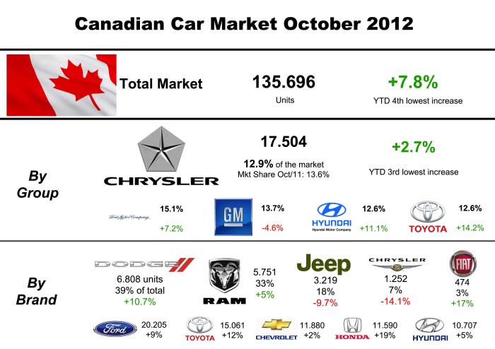 October 2012 wasn’t the best month for Chrysler in Canada. Though they got positive results and total sales are up 3%, it was not enough to compensate the rise of total market. Chrysler plus Fiat brand sold 17.504 units, just 455 units more than previous October, while total market was up 8%. That’s why Chrysler got its lowest market share so far this year: 12.9%. The reason for this result is pretty similar to what happened in USA in the same period. The two best-selling brands of the group increased their sales registration but those were negatively affected by the fall of the other two. Dodge (that counted for 39% of the total) is up 11%, while Ram delivered 5.751 of its cars, up 5% (the Ram is the best-selling car of the group in Canada and occupies place number 2 in Canadian ranking). It means that only Dodge gained market share, thanks partly to the good performance of Grand Caravan (by far the best-selling MPV in the country), up 13%, the Journey (+11%) and more units of the new Dart, which is now Dodge’s third best-selling car over there. The other two brands, didn’t do like that. Jeep was down 10% (or 344 units), and Chrysler fell a worrying 14% (or 205 units). The Wrangler did again quite well (+22%) but the Grand Cherokee slowed down (+3%), the couple Compass-Patriot fell (-10% and -32%), while the Liberty disappeared from sales figures with only 10 units registered. Chrysler’s result is a direct consequence of the extreme fall of 300 model, down 59%, and Town & Country (yes, is the same model of the popular Grand Caravan). Fiat sold 474 units of its 500 model, which is not good at all, well it is the worst second result so far this year and the fourth consecutive month of fall.