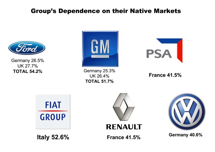 This Figure shows the percentage of homeland sales. Almost 53% of Fiat Group’s sales in Europe corresponded to Italy during October 2012. Ford and GM depend on two main markets, while Fiat Group is highly dependent on just one market, which is not good at all. Surprisingly VW Group’s big sales are not exclusively in Germany, which counts for 41% of them. Source: ACEA, Autoblog Español