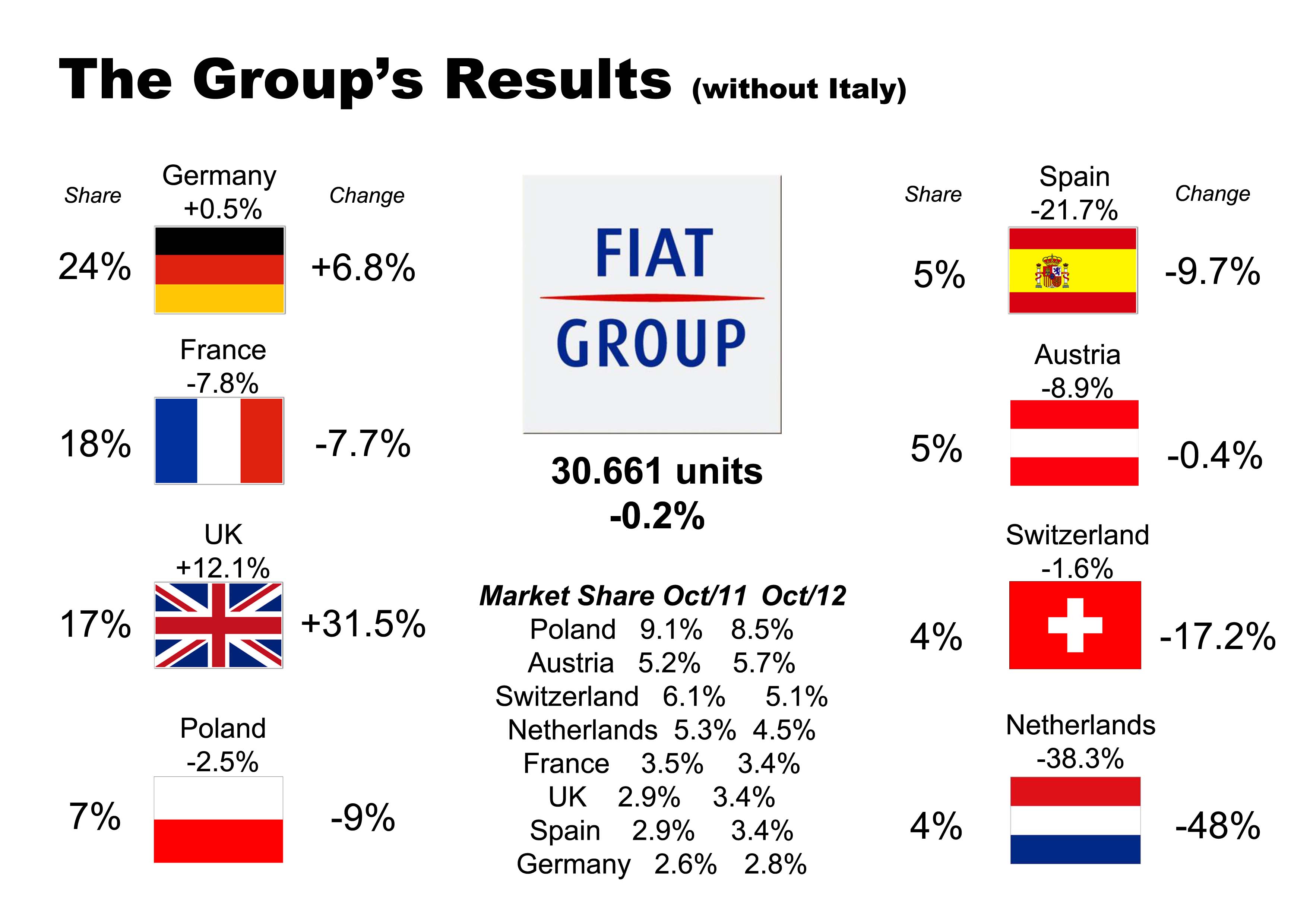 Fiat Group is not really suffering outside Italy. Germany is the largest market in terms of units sold but is the lowest in terms of market share. Good for the UK, Spain and Austria. France is some how stable while the Netherlands and Switzerland did very bad. Source: Autoblog Español, Automotive Austria, ACEA, Rai Netherlands, Auto-Suisse, Carsitaly.net