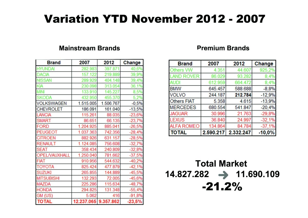 In just 5 years the market collapsed and now 3.14 million fewer cars are sold. Fiat is one of the most affected as all of its major brands fell more than the market (only Ferrari and Maserati gained market share). Excellent performance of Hyundai-Kia (together they sold 6.000 units less than Fiat-Alfa-Lancia combined in YTD Nov 2012). The only VW brand to perform bad was Seat. If the trend continues Skoda may overcome Fiat brand in the next years. Source: ACEA