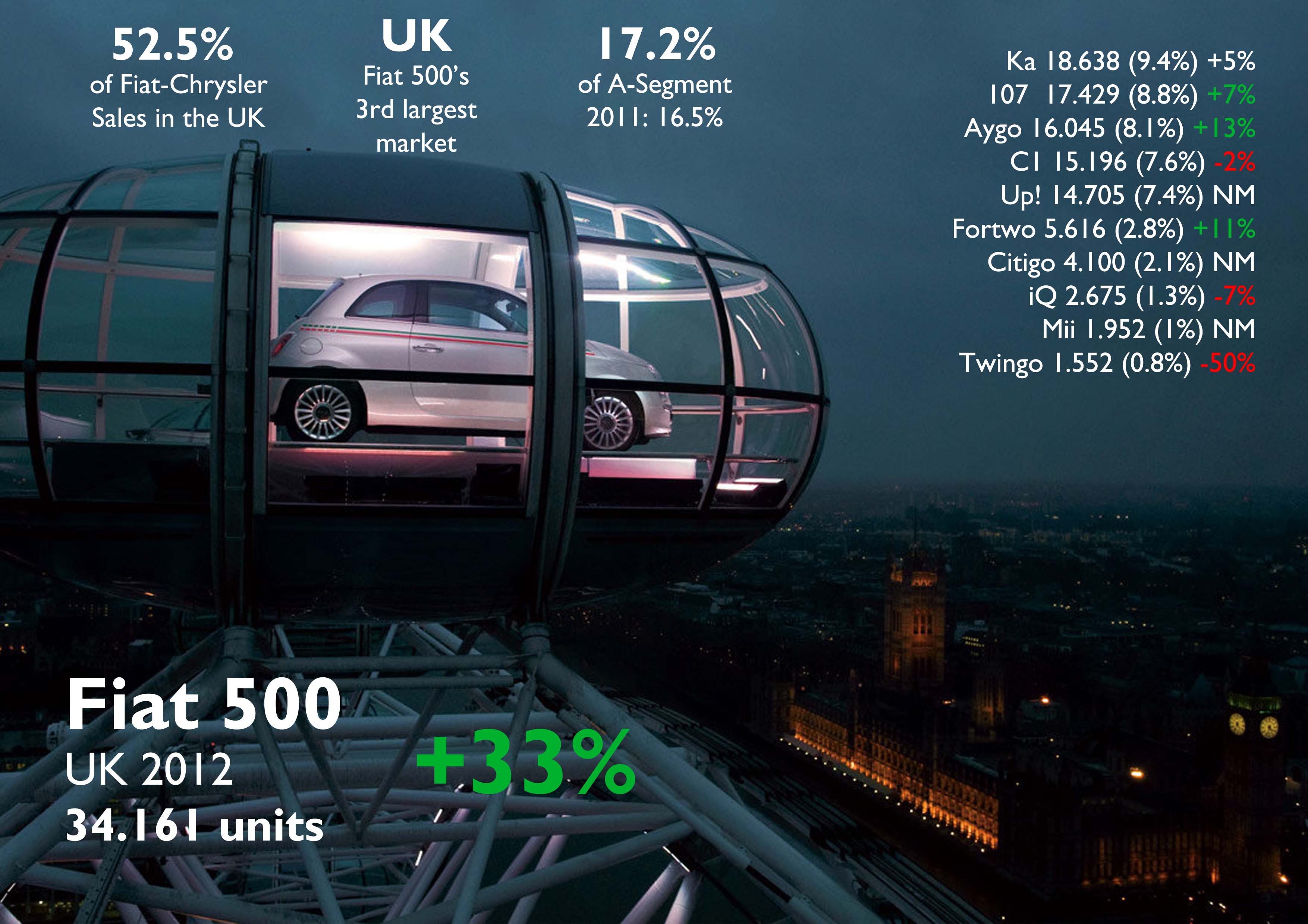 UK is the third best-selling market for the Fiat 500. It is absolutely a success since its introduction in 2008. Last year it had a record year of 34.000 units, up a massive 33%. It is only 9.000 units behind USA and Italy and doubles German registrations. The citycars boom has been correctly exploited by the small Fiat. It is not the case of the Panda, which has not had the success it should had had. It is up 13% but is very far in the A-Segment ranking, with only 7 thousand units. Actually it is just units behind the Punto, which didn’t do as bad as it did in Europe: it is down 8%, and is still quite ahead of its cousins, the MiTo and Ypsilon, which debuted with 2 thousand units, not bad for this new ‘Chrysler’. In fact, the UK became its third largest market, ahead of Germany. The same happens to the Chrysler Delta, with 644 units sold, ahead of Germany too. The Giulietta had a good start but last year it was down 40%: the lack of more body types and sporty versions begins to affect its performance. The remaining models had marginal sales. Fiat does not sell the Freemont in the UK, and the 500L just arrived in February 2013, so its presence in MPV segment is really small.