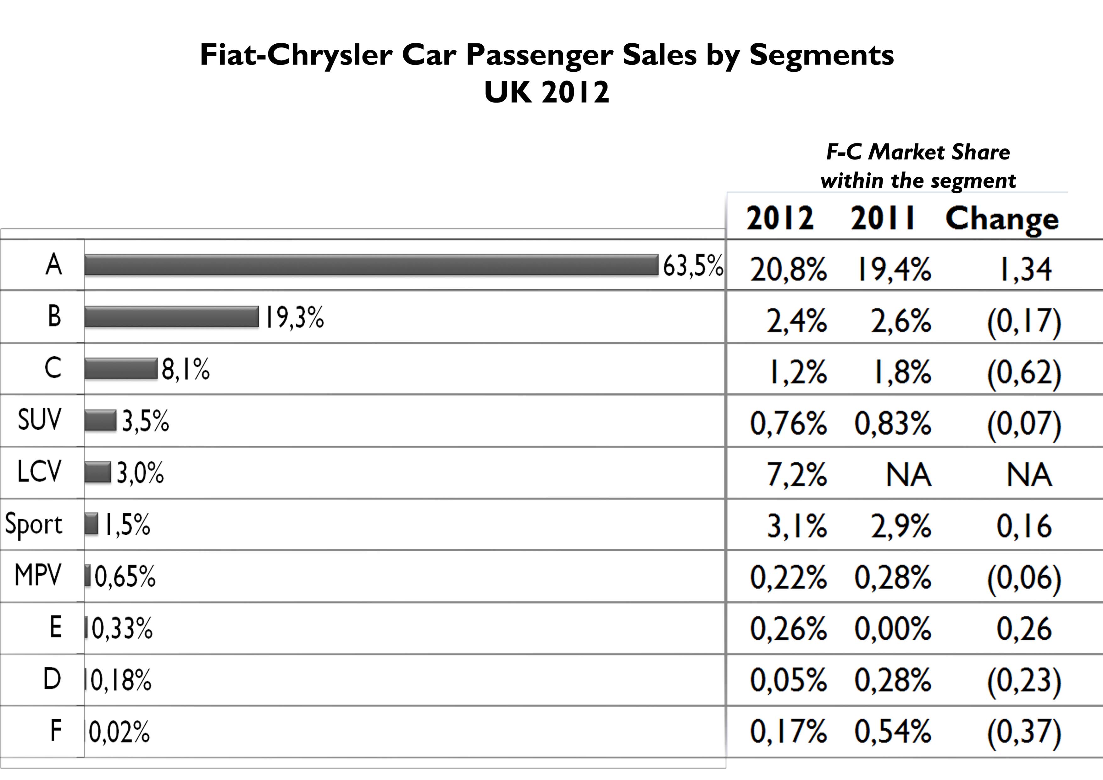 The group caught 3.18% of the market, which is less than the share in France and Spain, but is more than the one in Germany. Fiat brand counted for 79% of group’s total sales, while Alfa Romeo captured 11%. Thanks to new Lancia products, Chrysler brand increased its share 3.12 bp and now counts for 5% of the group’s sales. Ferrari impresses too: 674 units were sold, counting for 1%. Finally Jeep did not do a good job and now is behind Chrysler. In terms of segmentation, the group’s sales are strongly and dangerously concentrated: the Fiat 500 counts for 53% of total sales! yes, this model is very popular in the UK but shouldn’t be the only successful model of the group. Besides, it is getting old and competition gets more and more difficult, so Fiat should not rely on its success to maintain its position in this market. If we add the Panda’s result, then Fiat-Chrysler sales in the UK are dominated by A-Segment: 64%. That is 20 bp more than in France, and 25 bp ahead of Germany and Italy. Behind the A-Segment, there is B-Segment counting for 19% of total sales. So A+B segments count for 83% leaving only 17% or 11.000 units to remaining segments. It means that the only strong position within segments is in ‘A’ one, where the group controls 21%. In the other segments, even in Sporty one, Fiat-Chrysler has a weak position.