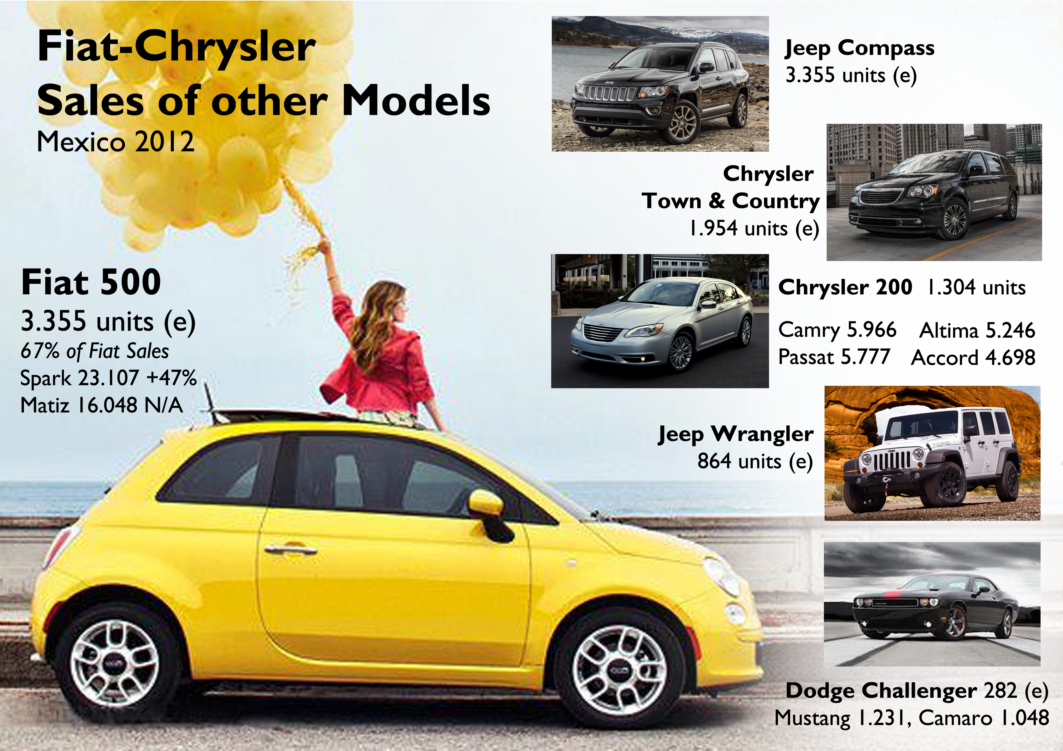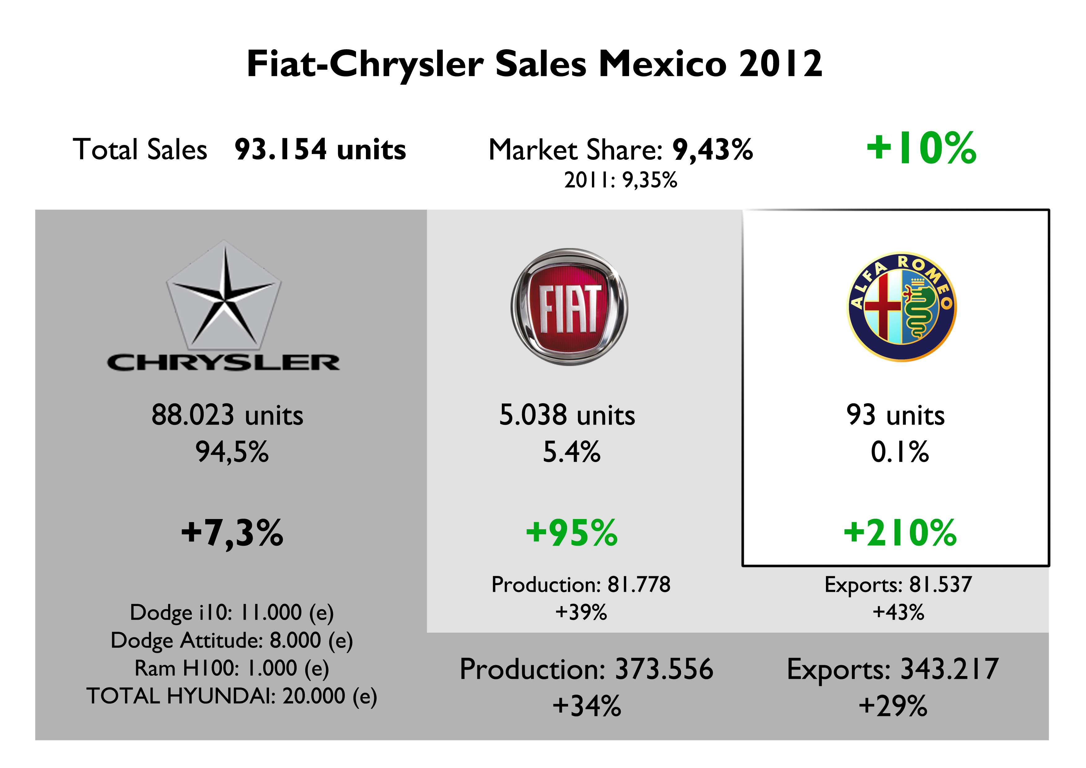 Thanks to the extraordinary performance of Dodge Journey and Jeep Patriot, the group increased its share in almost 1 bp. Nevertheless, it is still far from the group’s target of 11% by 2014. Things may get even better this year thanks to the arrival of Dodge Dart, which is going to be the first C-Segment car the group offers since the Neon died some years ago. The Journey is the absolute leader of its segment and became Mexico’s 14th best-selling car. Then comes the Patriot with more than 8 thousand units sold, up 2%. From their yearly change it is evident that a big part of the group’s growth in 2012 came from Hyundai models. The Compass is another key player with more than 5 thousand (e) units sold. But the rock star of the year was the Fiat 500, that finally took off with circa 3.300 units. It means that this little car counts for 67% of the brand’s sales in Mexico. This model helped the brand to increase its sales by 95% and get close to Peugeot. The problem with Fiat brand is its image among Mexicans. The brand left the country twice before its come back with Chrysler. It had a very bad effect on its reputation. Besides, most of the offer comes from Brazil, and these are cars with a different approach in terms of quality. Alfa Romeo’s position is even worse. Its reputation is OK, but as it happens in Argentina and Colombia, after its introduction in Mexican market, its sales reached a top in 2012, but they are still marginal compared to other brands. This is because of lack of new models (this is why I think Alfa Romeo should wait till it has more models to start business in Brazil).