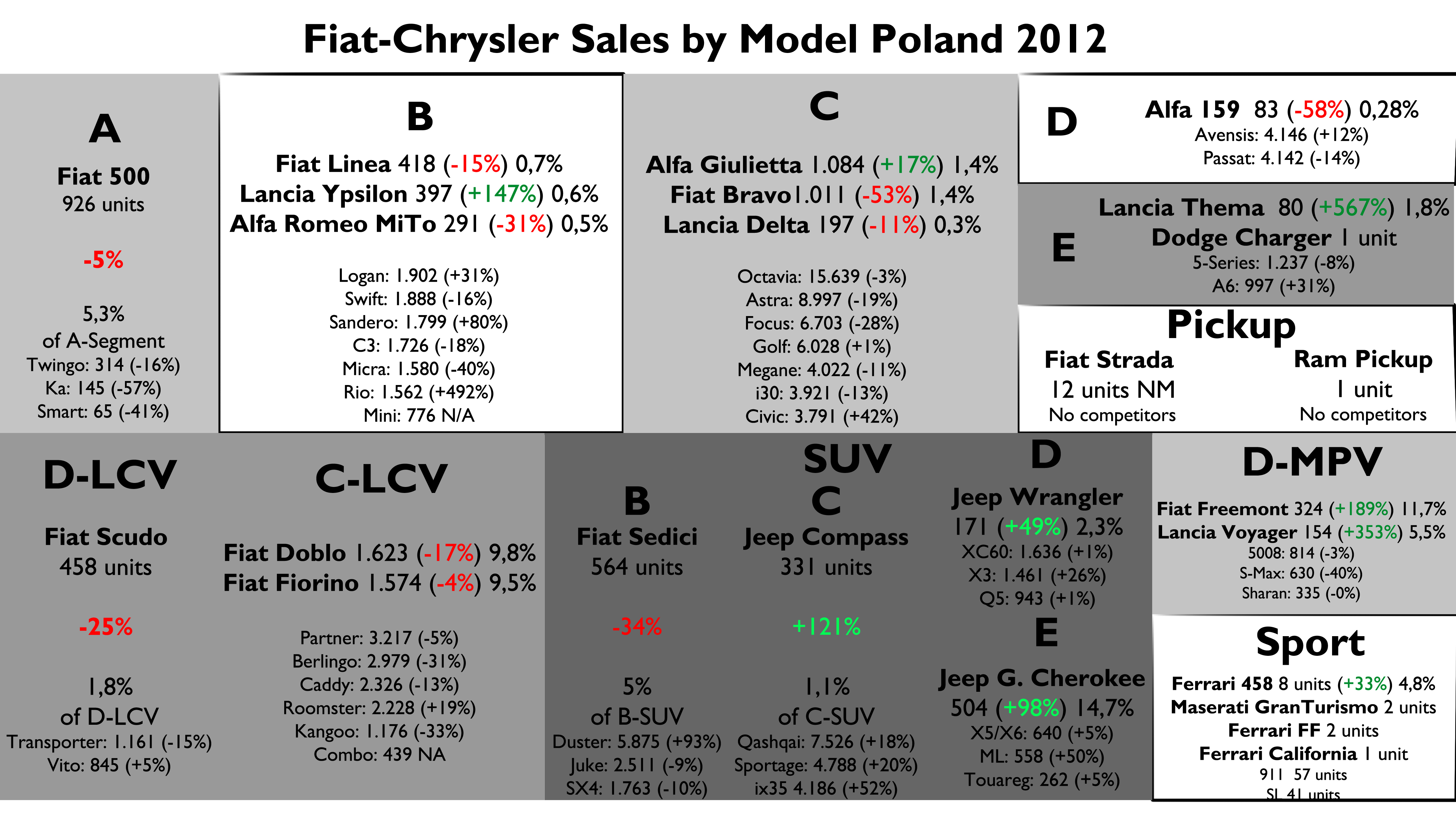 The Panda is the model with the best share within its segment: 34%. Then comes the Ducato which controls 19,5%. Third position is surprisingly occupied by the Jeep Grand Cherokee, which had a great year and now controls 15% of its segment. The Freemont did also very good with 12% of D-MPV. The Delta, Ypsilon, Linea and MiTo had very low shares. The group needs a new C-SUV as soon as possible, as the Compass/Patriot are far away from the leaders (they have 1,1%) in a segment that is now Poland’s third largest. The same happens for D-Segment as the Alfa 159 said goodbye and there isn’t any immediate successor (this segment counted for almost 10% of the market and the Alfa got 0,3% share).