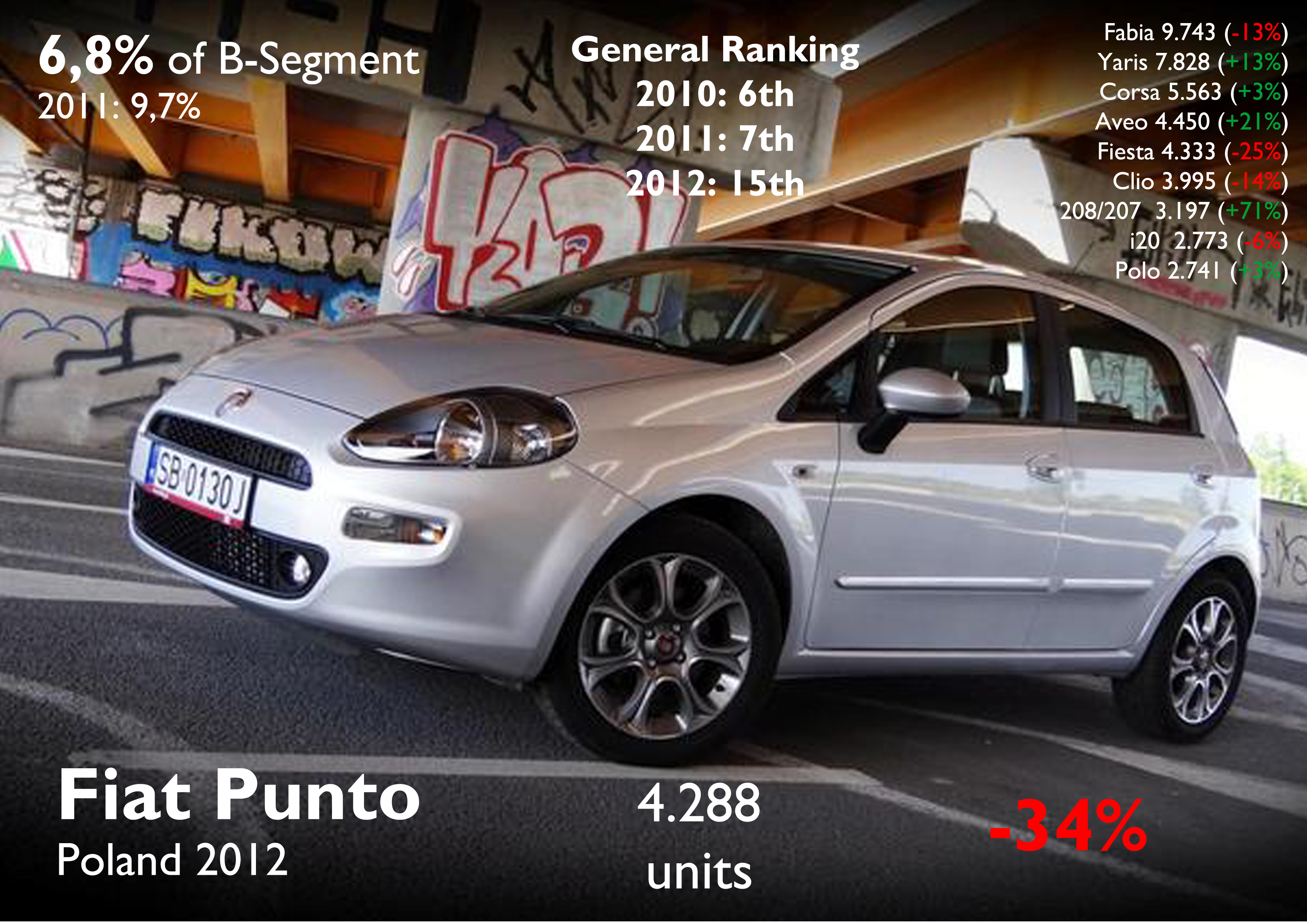 The Punto lost big market share in 2012. Now it is not among the best-selling cars in Poland and competition from Chevrolet and Toyota had a big impact on its sales. Is not usual to see a VW so down in the ranking. Photo by: se.pl. Source: FGW Data Basis, carmarket.com.pl, Best Selling Cars Blog