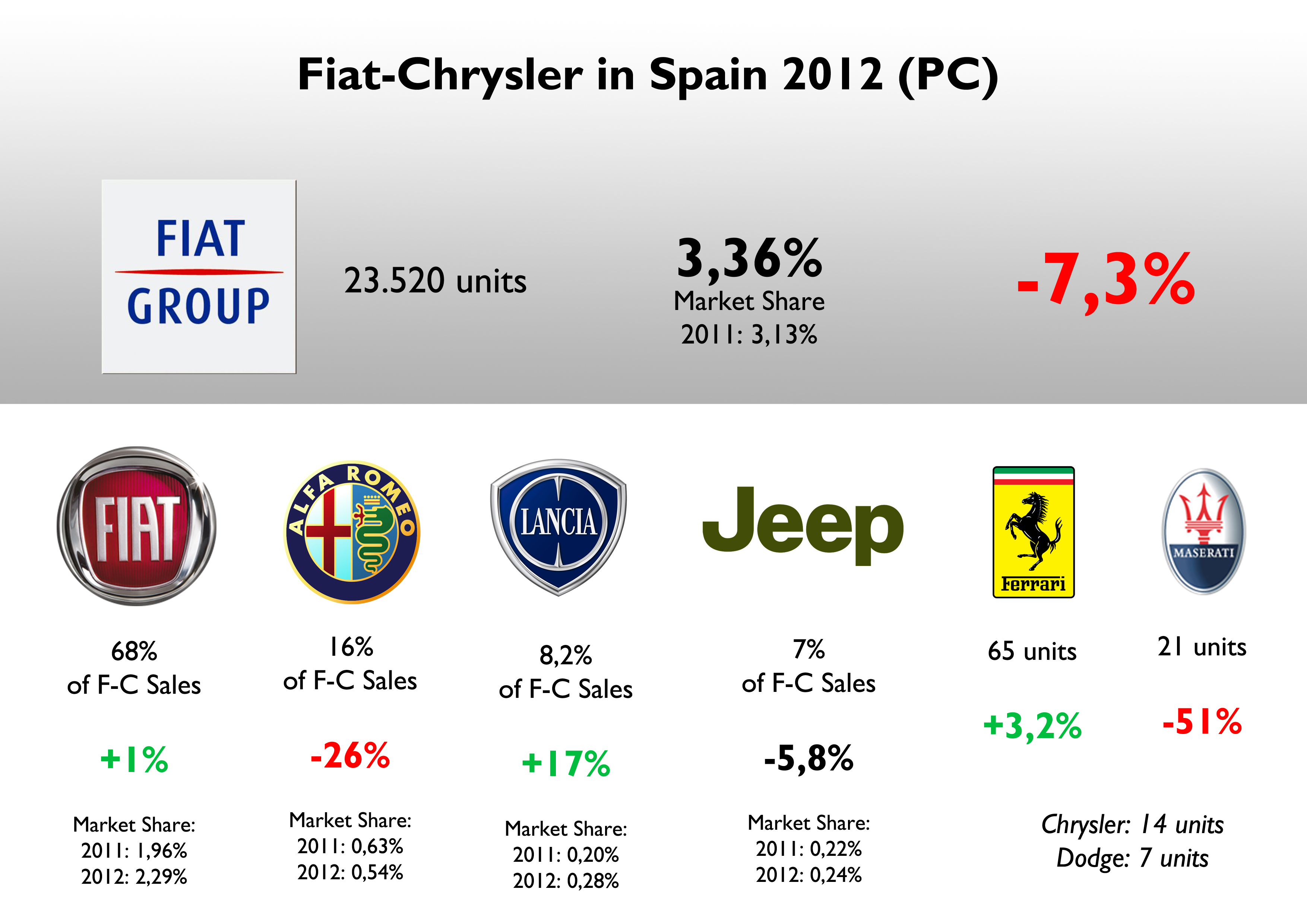 Spain was 8th largest market for Fiat-Chrysler in Europe in 2012. In terms of market share, Spain is above Germany, the UK and France. Alfa Romeo is the cause of the group’s overall fall, along with Dodge and Chrysler that stopped selling cars in this market. Ferrari didn’t bad at all with 65 units. Alfa Romeo doubles Lancia’s sales even if it counts on only two models. Source: FGW Data Basis, ANIACAM
