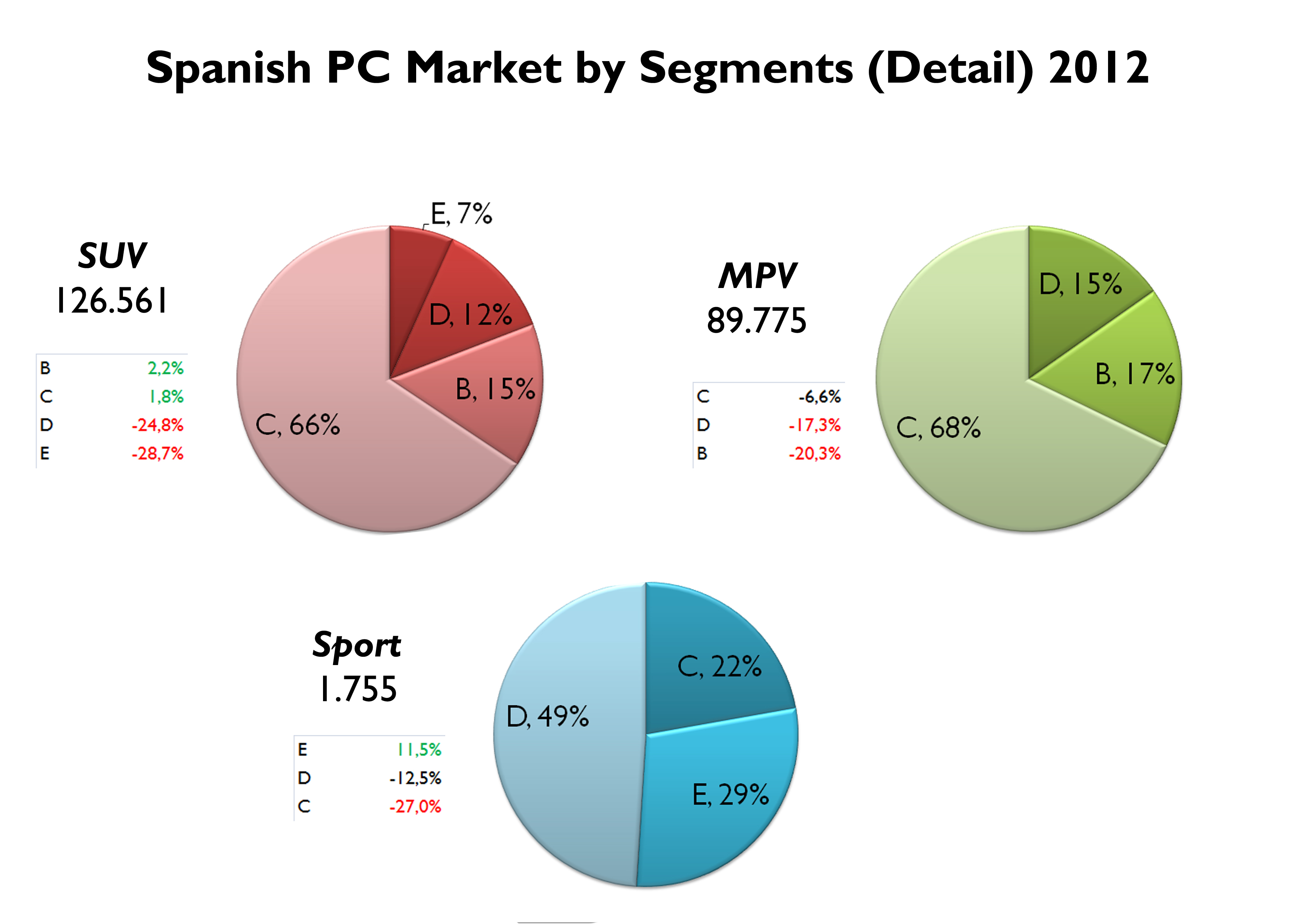 2 out of 3 SUVs sold in Spain correspond to Compact ones. Bad performance for all SUVs and MPVs. Luxury sporty cars gained share despite the economic crisis. Source: FGW Data Basis