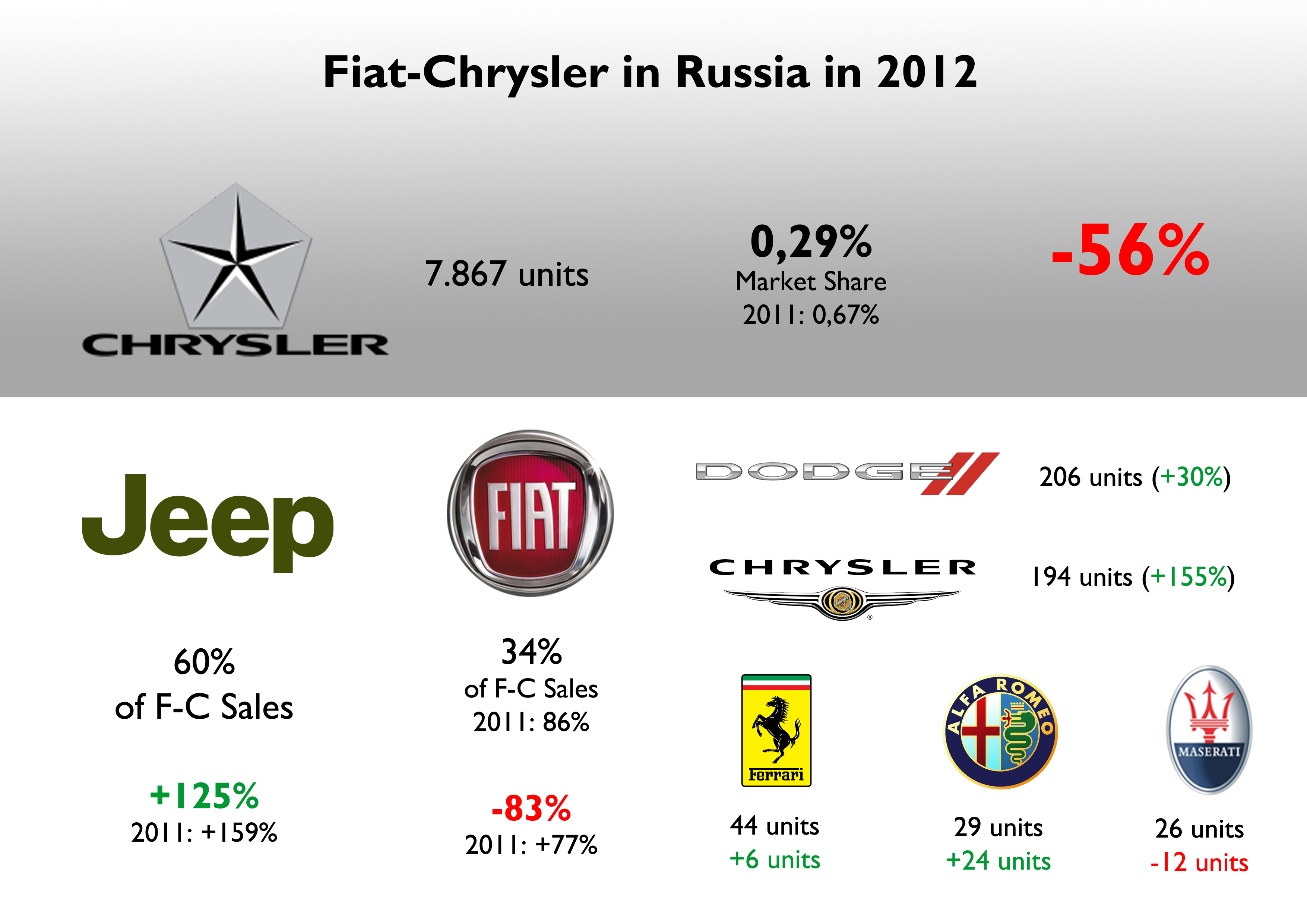 Too bad, very bad the position of the group in Russia. If it is already bad in India and China, in Russia is even worse with a tiny 0,29% market share, down 0,43 basis points. The whole group sold 7.867 cars of all brands, down a massive 56%, the highest of all car groups in Russia. This bad results are as shocking as the plans the group has and always has had for this important market. The reason for this drop is explained by Fiat brand, extremely unpopular among Russians. This brand’s registrations fell 83% as a direct consequence of the change of distributor and a shorter range of products. In late 2011, Fiat and Sollers stopped their Joint-Venture to produce cars in Russia, making more difficult to sell competitive products one year later. In total, Fiat halted its production and therefore the sales of its most popular models (those built locally) fell dramatically: 85%. Fortunately, the group’s sales rely on more brands and Jeep had a great performance in 2012, up 125%, and became the first of the group by volume. This is why Fiat placed Jeep as the first brand to be produced locally in the future.