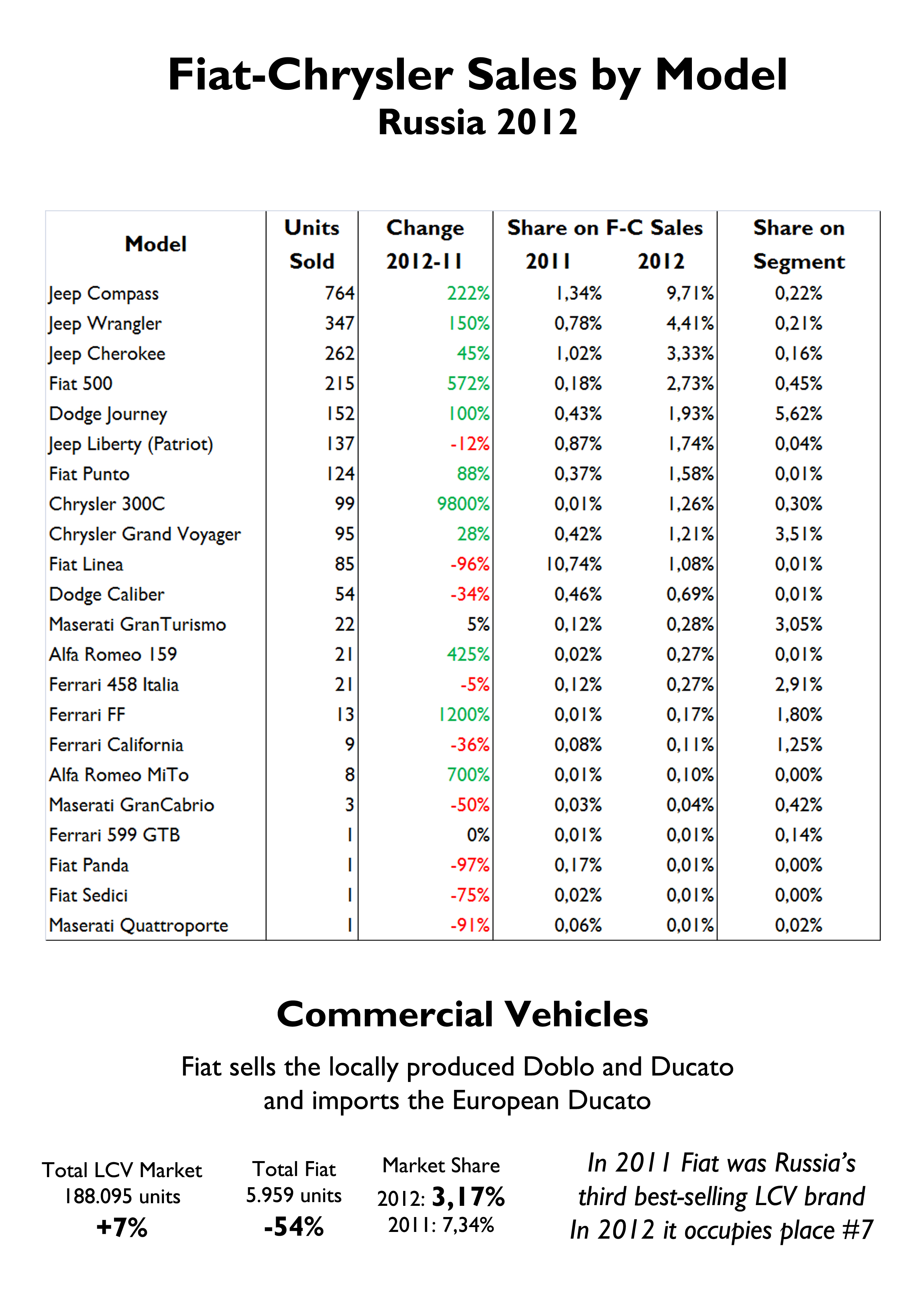 It is worthless to make a close analysis of the models sold by the group in Russia as most of them have marginal shares in their segments. The Grand Cherokee became the best-selling model, more than doubling its previous registrations and catching an important share in E-SUV segment. As production of Linea, Albea and Doblo halted in late 2011, their sales in 2012 corresponded to the remaining stock. Fiat imported some units of the 500 and Punto. Ferrari and Maserati sold more units than Alfa Romeo, while Dodge and Chrysler sold some units of the Journey and 300. In total, all brands had very low sales, but only Jeep had an interesting performance thanks to the SUV boom. Fiat must accelerate its plans in this country (like in China and India), in order to increase its share up to 1% or 2% in the next couple of years. Jeep has an enormous potential but consumers won’t wait for to long to buy a locally made one. Russian SUV segment may be the world’s most promising in terms of potential. As long as there is no local presence, Fiat will continue to be the last option when buying a car and Jeep will continue to be the unaffordable but desired brand. In 2013 Fiat will introduce the Freemont and ultimate generation Doblo, and Alfa has already sold 9 Giuliettas in March.