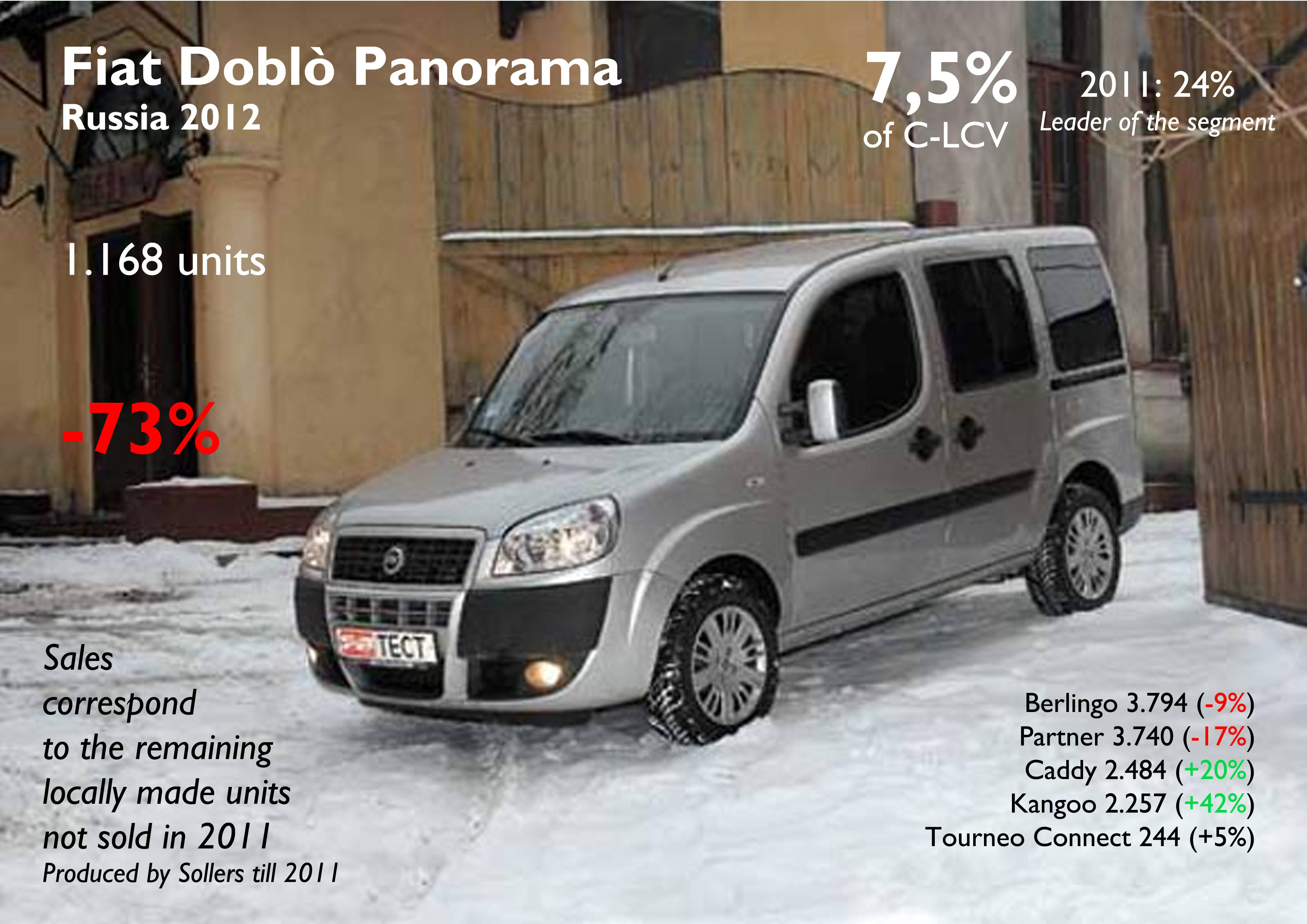 The Doblo used to be Russia’s best-selling Passenger LCV, but after Sollers divorce they just sold the remaining units they didn’t sell in 2011 and start imports from Turkey, so price was much higher. Fiat does also sell the Commercial version of this model along with the Ducato. Source: FGW Data Basis, Autoreview Russia