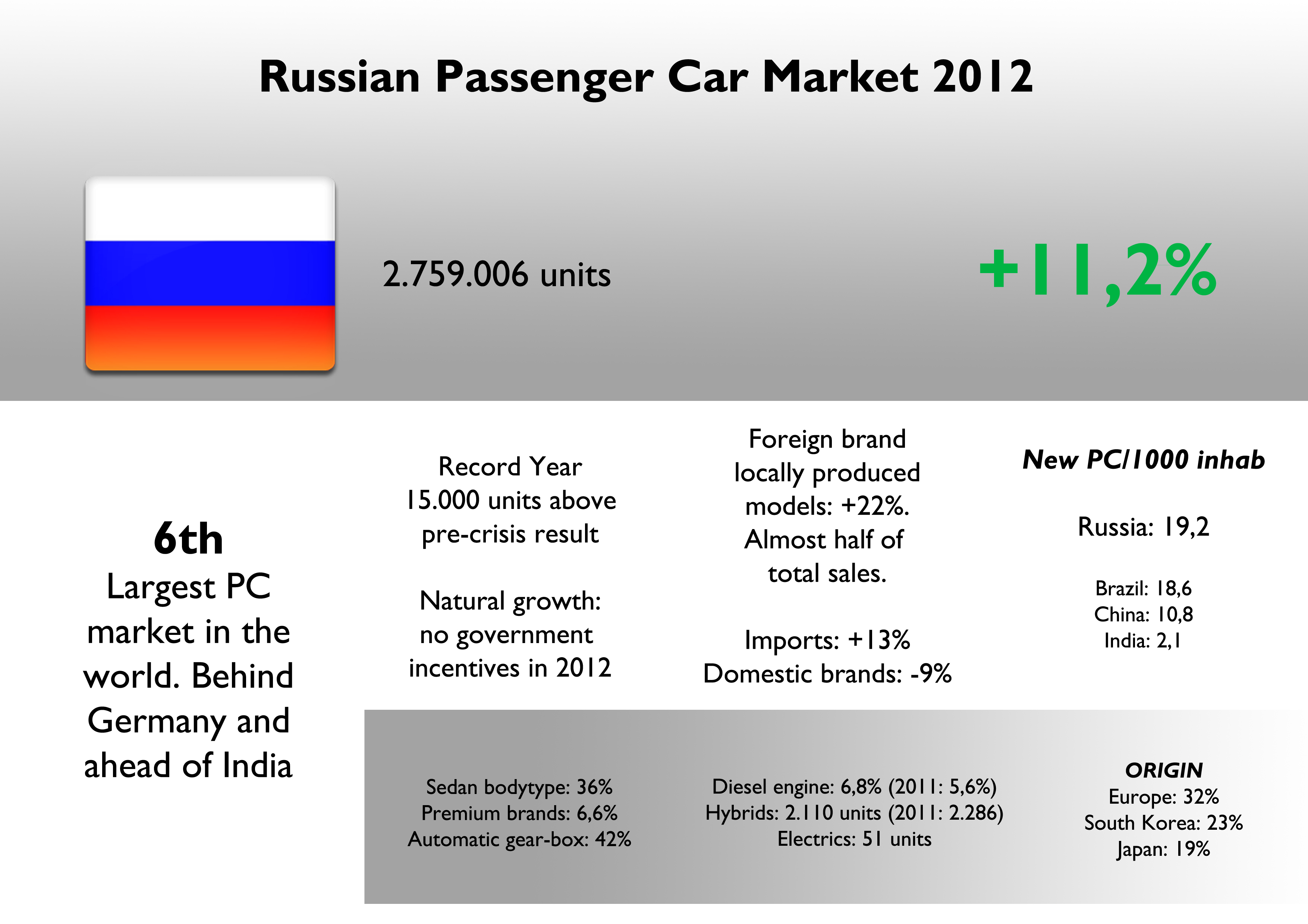 Russia is now one of the largest car markets in the world thanks to a government policy that boosts local production. It is a market with strong incidence of sedans and lately SUVs. It has the best New cars/1000 inhabitants index among BRIC countries. Source: Autoreview Russia