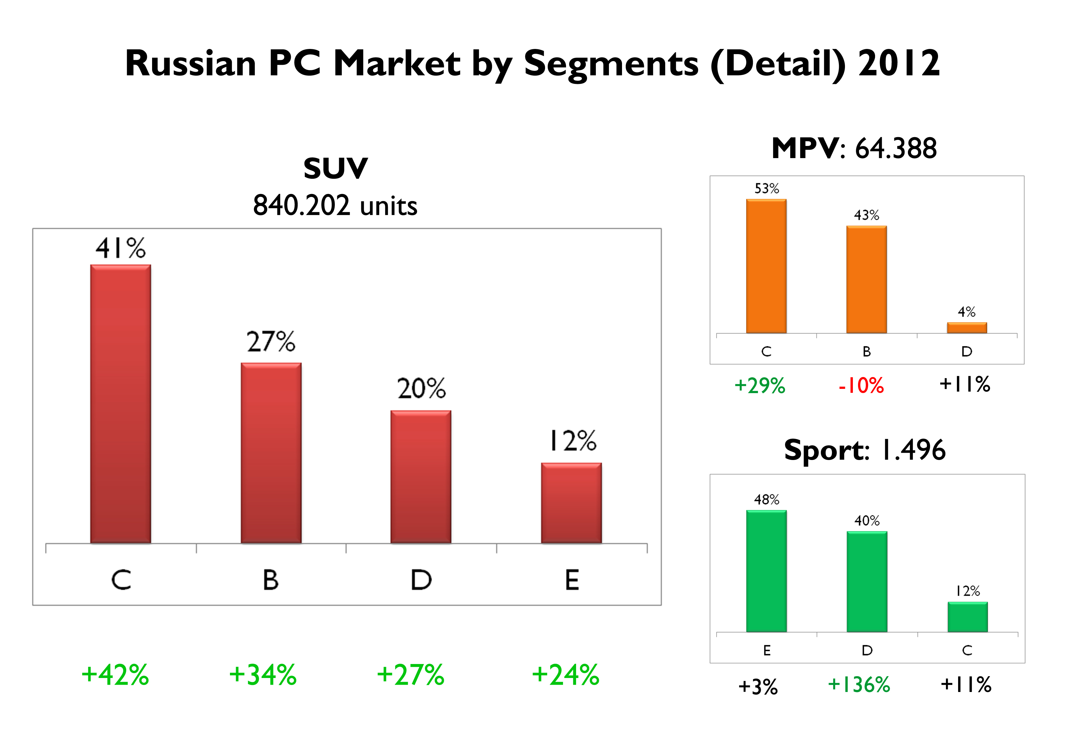 Russia is one of the few countries where SUVs are the second largest segment. Its growth was amazing. It was the segment that pushed the whole market up as small cars didn’t have a good performance. Citycars are not popular at all. Source: FGW Data Basis, Autoreview Russia