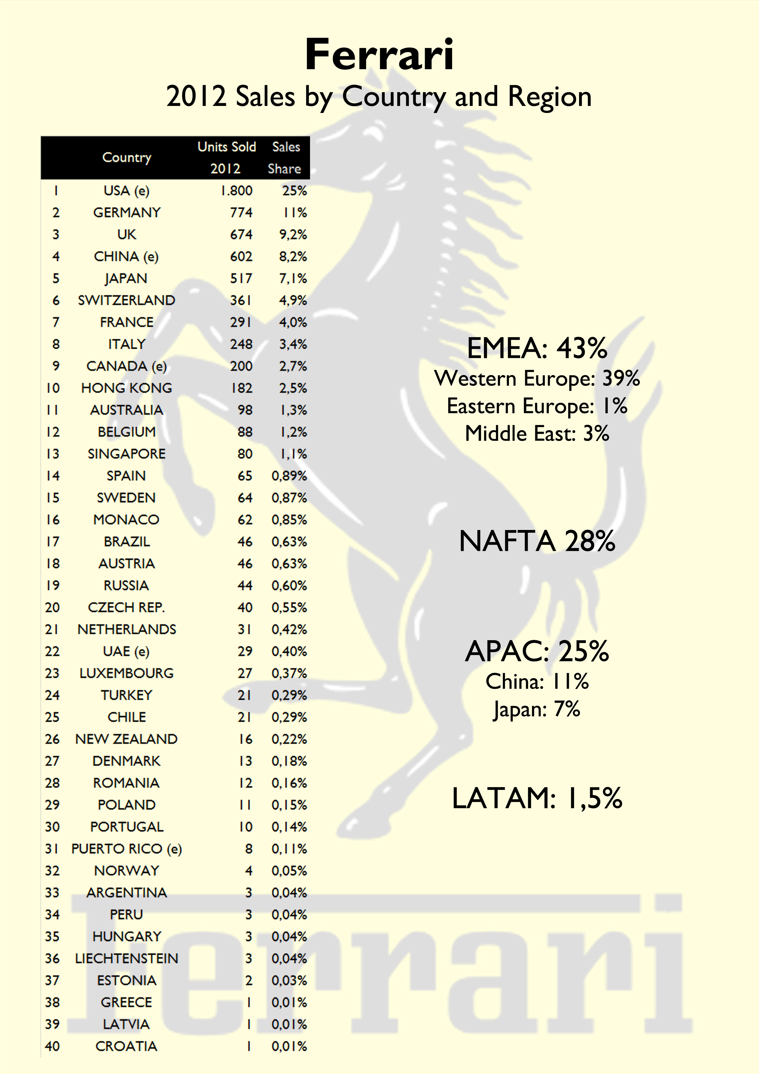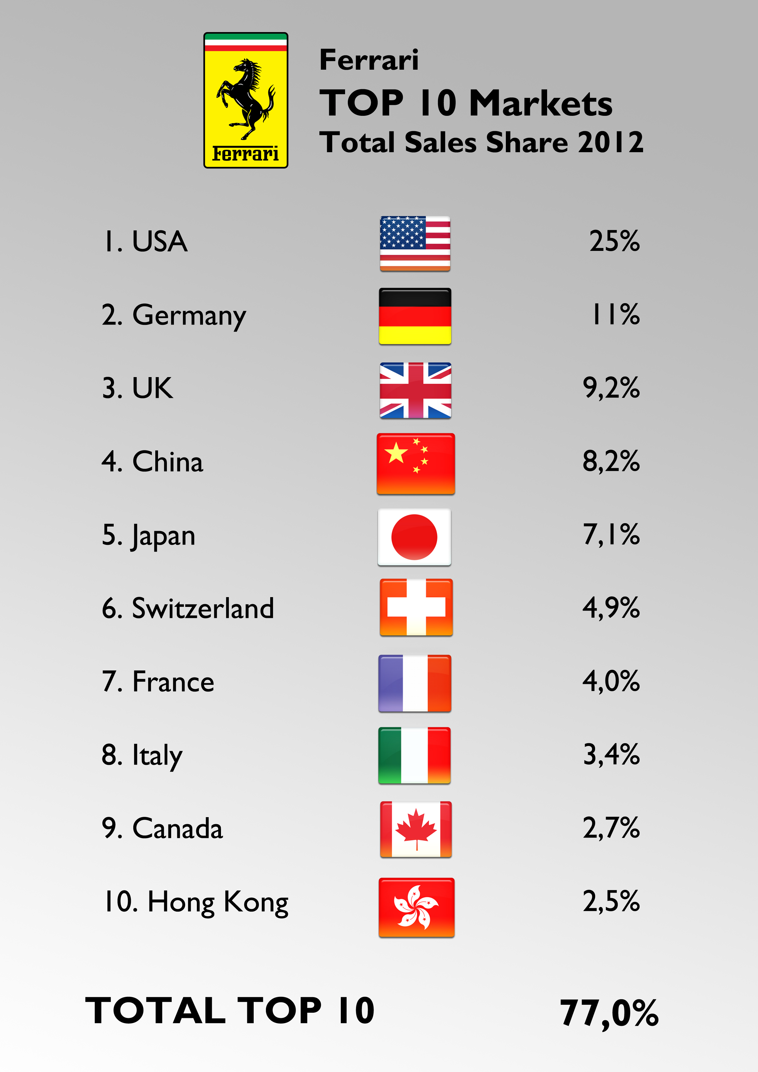 This chart doesn’t include the Middle East countries, where Ferrari has a strong presence. Even though, Italy is quite below in the ranking, behind 4 European markets. Source: FGW Data Basis