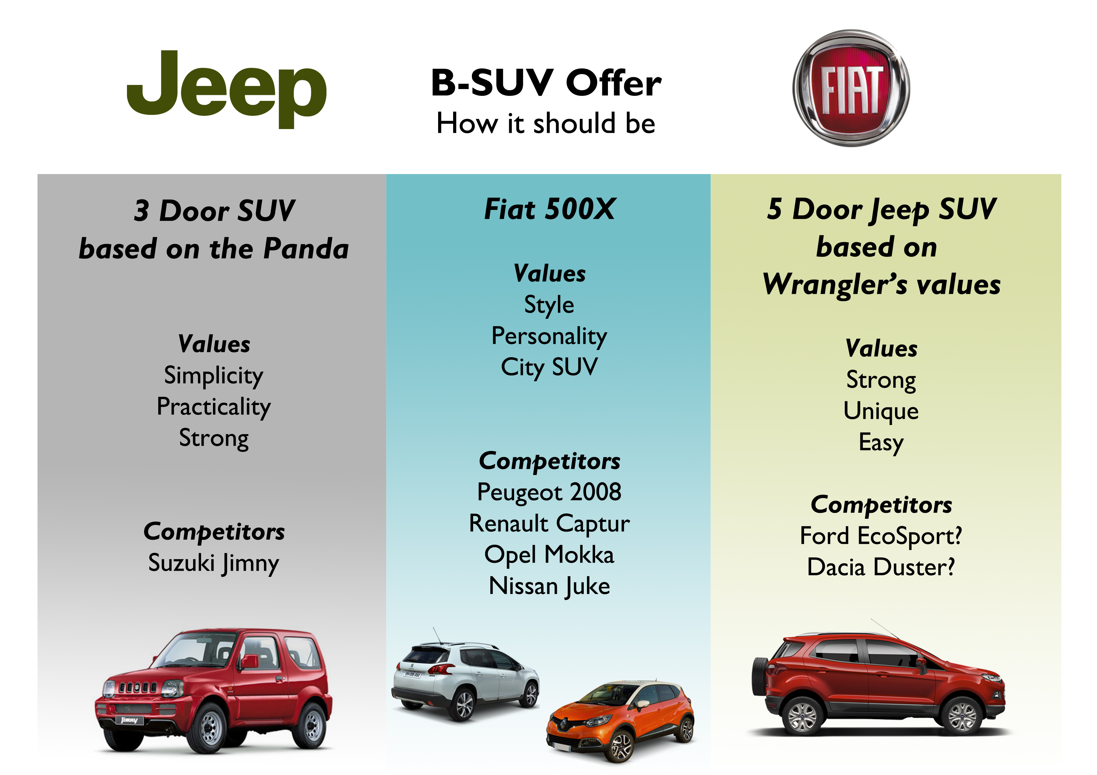 B-SUV offer Fiat ChryslerFinally, the offer in the entry-level SUV segment could be perfectly completed with a 3 door mini SUV based on the Panda. As I wrote in a previous article, Fiat brand should enlarge the success of the Panda just as it is doing with the 500. The Panda 4×4 is one of the few 4WD options in the segment, and people like it, despite its high price. The B-SUV segment is becoming more and more important in Europe, but there isn’t a 3 door SUV yet. The only offer is the Suzuki Jimny, which had interesting results in some European markets. But Fiat can exploit the values of the Panda and take them to a 3 door functional SUV for those looking for a simple and practical SUV, and not the stylish and sophisticated Renault Captur, Peugeot 2008 or Nissan Juke. In this way Fiat-Chrysler would have a complete range of products in one of the fastest growing segments in Europe: a 3 door practical and simple Panda SUV, a stylish 500X, and a rustic and strong small Wrangler.