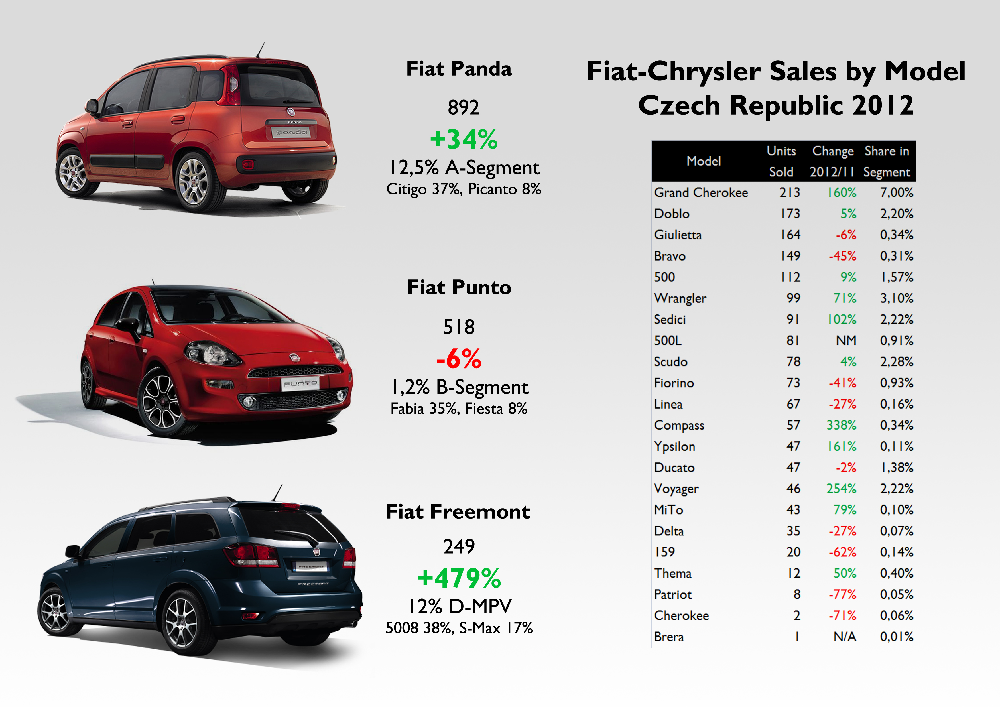 Fiat-Chrysler is really weak in this market with 2% market share and 3.463 units sold. Last year the group increased its registrations by 16%, thanks to Fiat, Jeep, and Lancia. Fiat increased its sales thanks to the new Panda, and surprisingly, to the Freemont, which was the third best-selling car of the group in this country. Contrary to what happens in the rest of Europe, the 500 isn’t popular at all, and even the Bravo outsold the popular mini car. Another surprise is the great position of the Grand Cherokee, with 213 units, up 160%. The unpopularity of the 500 allows the group to have a good balance of its sales by segments, with A-Segment ranking first with only 31% of total sales, and closely followed by B-Segment with 21%. SUV, MPV, LCV, and C-Segment have all similar shares. The Panda controls 13% of A-Segment, and is followed by the Freemont, with 12% of D-MPV segment. In 2013 the group could rise its registrations to 3.600-3.700 units with the arrival of the 500L and the restyling of the Grand Cherokee.