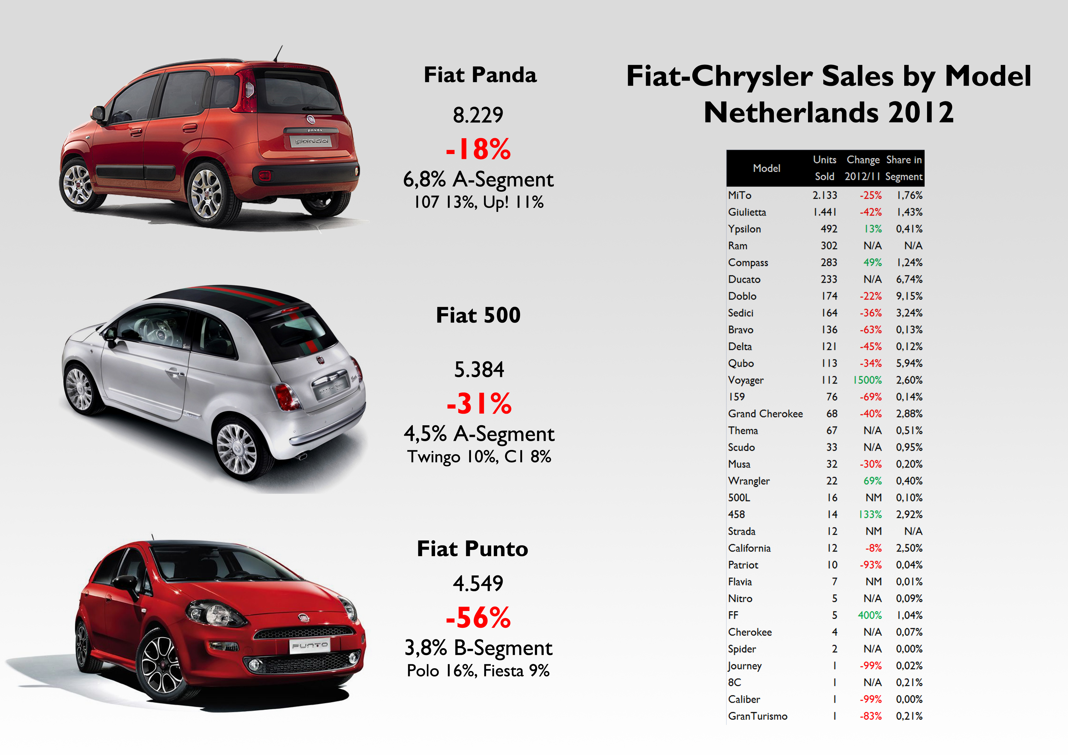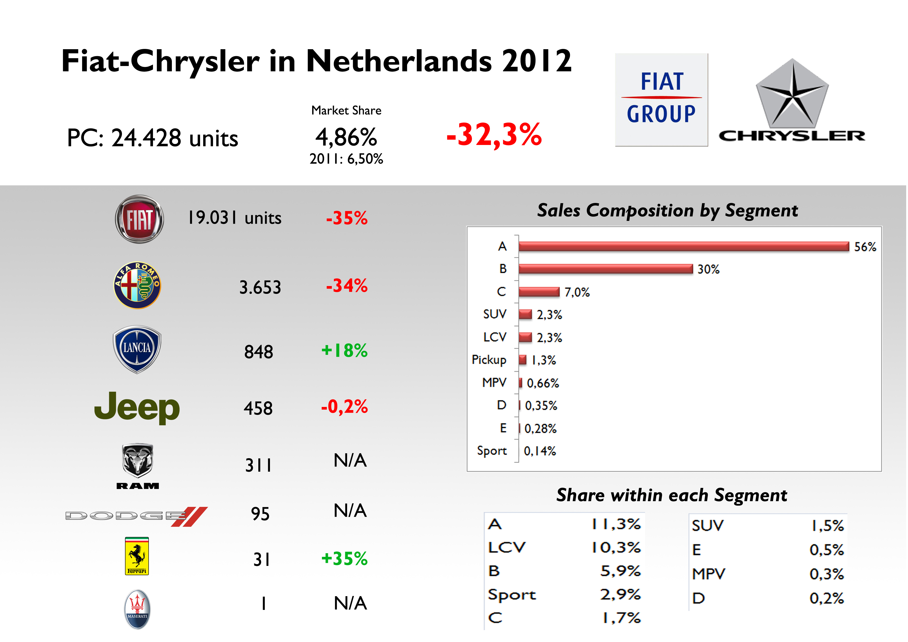 Even if the Netherlands is Europe’s second largest city car market in terms of share (after Denmark), Fiat-Chrysler’s position deteriorated dramatically in 2012. Total sales fell to 24.428 passenger cars (-32%) and 2.975 LCV. In terms of market share, the group controls 4,86% of the passenger car market, and 5,26% of LCV market. These numbers are better than the results in Germany, UK, France, and Spain, where the average market share was 3,2%. But this may get over as Fiat-Chrysler was the group with the deepest fall among big car makers. The reason for this? the VW Up! and the Fiat Punto. The arrival of the new VW city car had a big negative impact on the sales of the 500 and Panda, that fell 31% and 18%. Both products counted for 56% of the group’s sales. Besides, the Punto’s poor performance (down 56%) made Fiat brand to lose 1.5 basic points of share (-10.000 units). Alfa Romeo made part of the disaster, down 34%, enough to overshadow the good performance of Lancia, up 16%, but still very small (3,4% of the group’s sales).