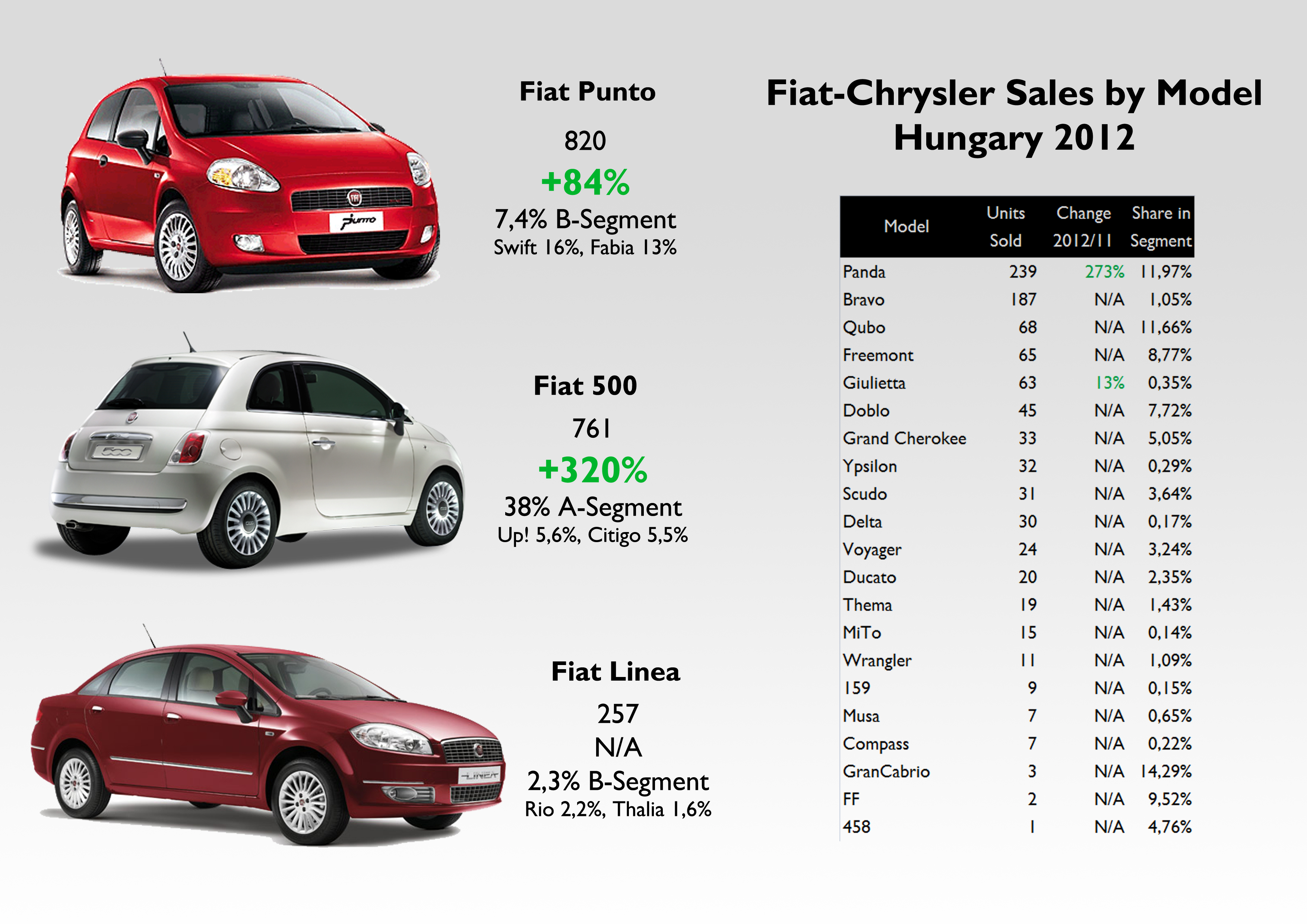 One out of 3 new cars sold last year corresponded to C-Segment. Hungarians love the Skoda Octavia, Ford Focus and many others. Then comes the B-Segment with 21% share, and SUV counting for 15,5%. City cars are not popular at all. Fiat-Chrysler sold 2.771 passenger cars and 1.570 LCV. It means that the group got a decent 5,2% market share in the PC market, and a wonderful 14,4% in LCV (one of the best, after Italy and Turkey). It jumped from place #9 in 2011 to #7 last year outselling Toyota and PSA. The good thing is that Fiat-Chrysler had the second highest growth rate among major groups. This was possible thanks to the great performance of Fiat brand that doubled its sales year-on-year. Lancia and Jeep had also a big jump but their contribution is very low: 4% and 1,8% of the group’s sales. Actually in 2012 Lancia outsold Alfa Romeo (-23%), thanks to the good mix of the Ypsilon, Delta and Voyager. Curiously the 500 isn’t Fiat’s top seller. It occupies second position, behind the Punto, while the Panda is in fourth position, after the Linea. One interesting fact that I personally confirmed after visiting Budapest in June, is the good position of the Bravo in that market. In 2012 it was the group’s 5th best-selling model and you can see it quite often in Budapest’s streets. The good market share doesn’t correspond to the way the group manages this market, as it doesn’t sell directly but through importers. Or maybe it is the reason for this good results; who knows.