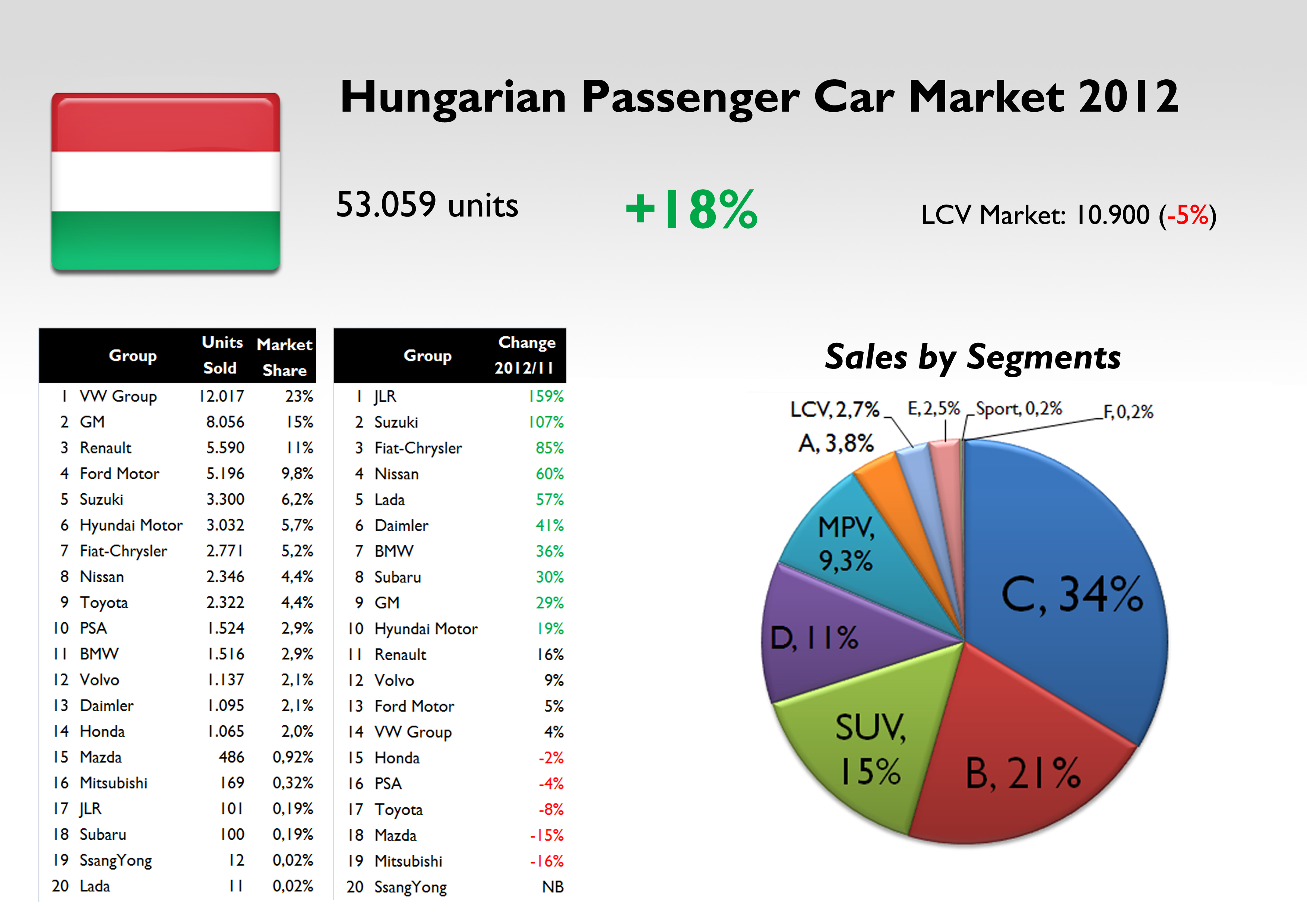 PC sales jumped 18% in contrast to what happened in the rest of Europe. The good economic momentum of the Hungarian economy allowed this result. Fiat-Chrysler occupied a decent position and was the third best performer compared to 2011 figures. Source: see at the bottom of this article