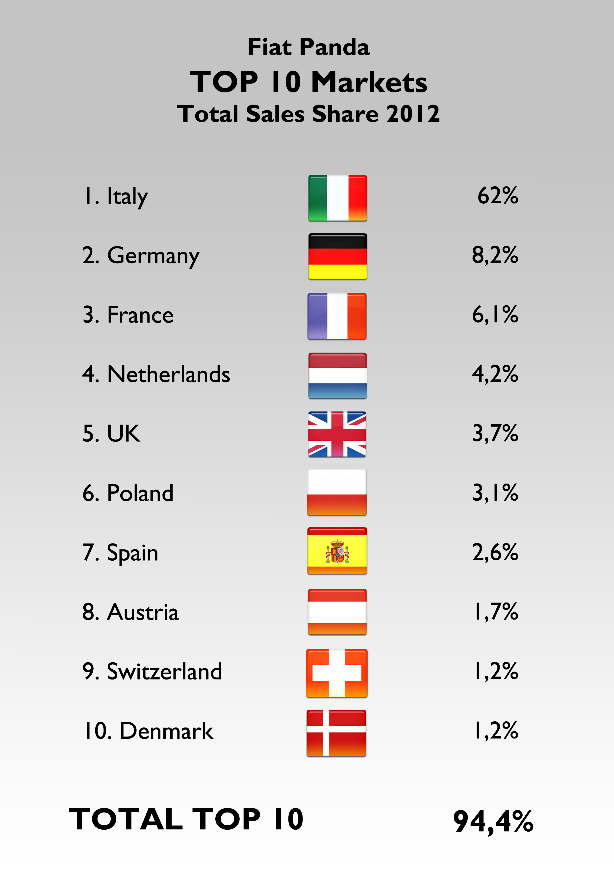 Italy is still a big market for the Panda. It is mostly sold in Europe. Source: see at the bottom of this post.