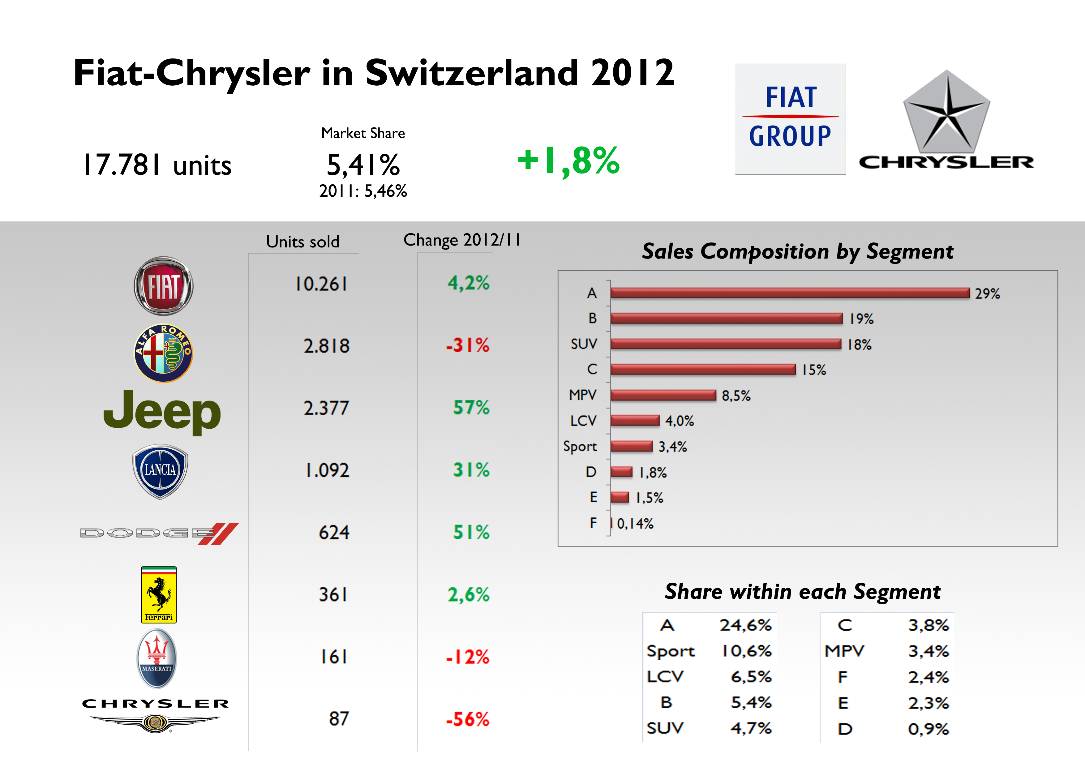 Swiss car market was able to sell 328.000 units, up a tiny 3%. The market was mainly boosted by a big jump in SUV’s registrations, up 19%, as B-Segment car sales fell 5%. Switzerland is one of the few European car markets where SUV segment ranks first (Estonia and Iceland as well), counting for 21,4% of total sales. In 2011 they ranked third as the best-selling segments, but the big growth on mid-size SUV (C and D) allowed this kind of cars to become the most popular in the country. As it happens in Austria, Swiss market is clearly influenced by Germans, and VW is of course the leader of the market. More than 29% of total sales came from VW Group cars, and VW brand, Audi, and Skoda were the top 3 best-selling brands in the country. But BMW and Daimler are quite strong as well, increasing their sales more than overall market. In the negative side, the other mainstream brands registrations fell, and Fiat-Chrysler lost 1 basic point of market share as its sales grew up only 2%. The reason for this low growth: Alfa’s bad results that had an impact on the excellent performance of Jeep, up 57%, and Lancia, up 31%. Fiat brand’s sales advanced only 4% to more than 10.000 units, counting for 58% of the group’s sales (VW brand counts for 46% of VW Group sales). The group’s best-selling models: the usual Fiat 500 and Panda, followed by the Punto, the Giulietta, and the Grand Cherokee, which plays an important role in Switzerland.