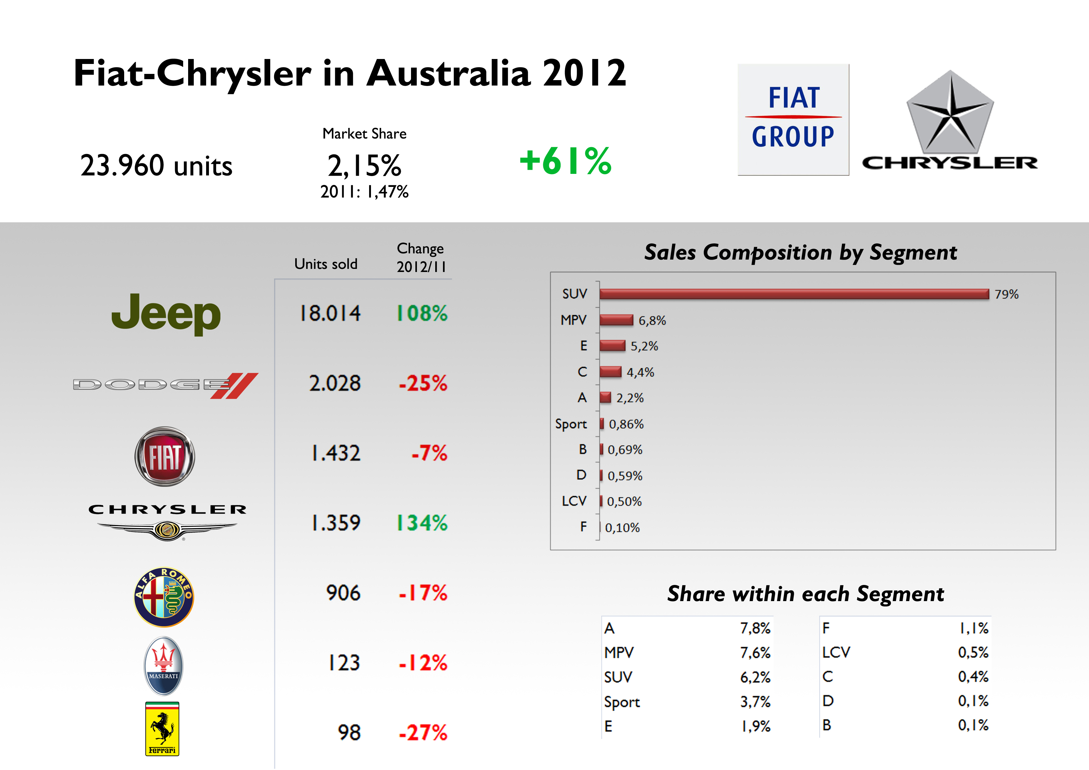 The good result of Fiat-Chrysler in Australia is due to Jeep’s excellent performance, up 108% or almost 10.000 units more. This jump, along with Chrysler brand’s positive growth (+134%) were enough to offset the fall of all the other brands of the group. Fiat and Alfa Romeo lost positions mainly because of the high prices and the arrival of the VW Up! which had a negative impact on the 500’s sales. This bad performance has changed for good in 2013, thanks to better prices and the fact that the 2 brands are now part of Chrysler distribution. Almost 80% of the group’s sales are SUVs, followed by MPV and E-segment. Certainly small cars are not the key products.