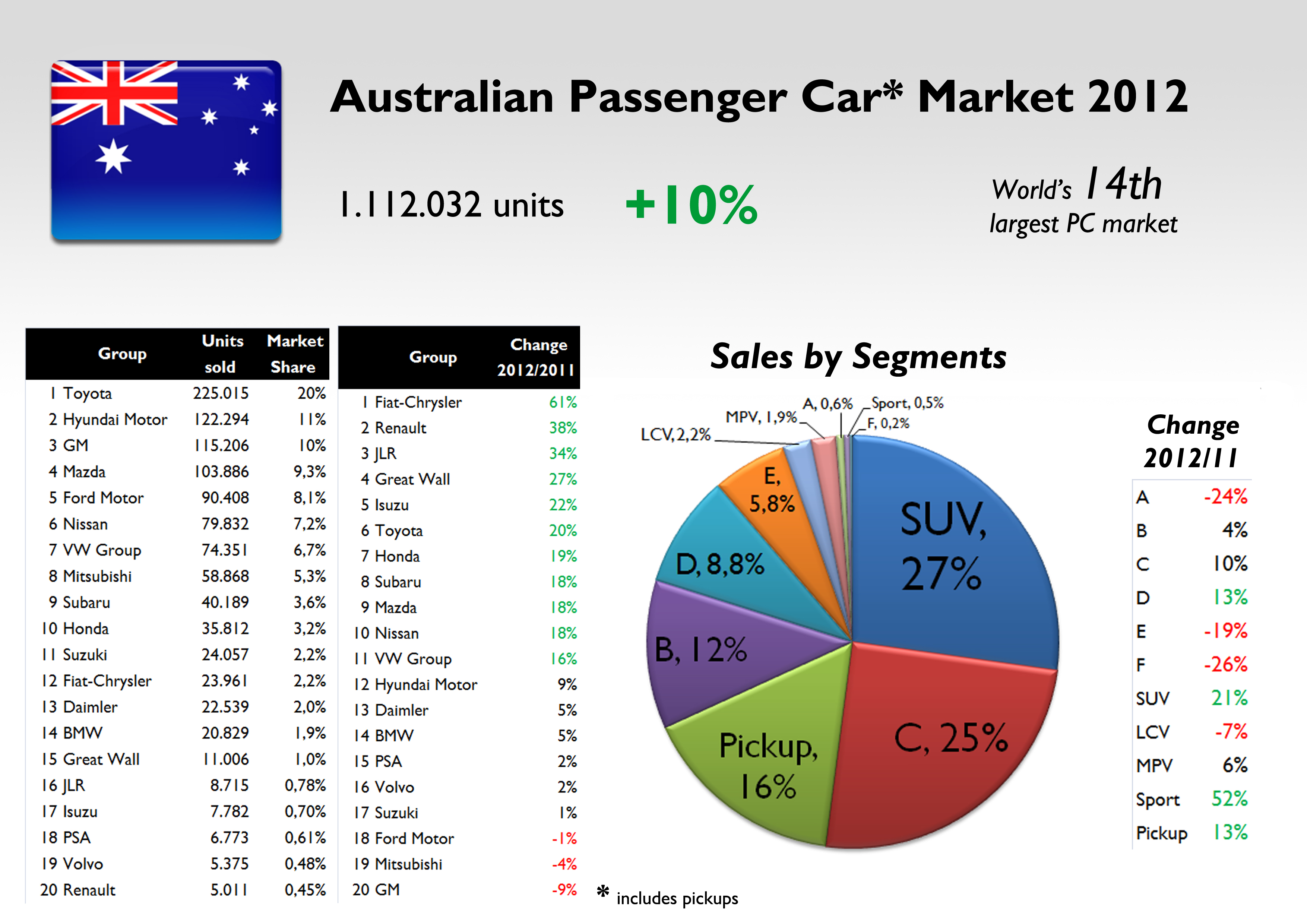 Australia was the world’s 14th largest passenger car market in 2012. More than 1.1 million units were sold, with a healthy positive growth of 10%. If this trend continues (YTD numbers indicate sales have advanced 4%*), this market could outsell Italy soon. Last year, SUV segment counted for the biggest part of car market, with 27% share. It was followed by C-Segment, and far by the Pickups. The growth was possible thanks to more mid-size SUV, C-Segment, and mid-size pickups on the roads. The biggest falls came from the city-cars segment, E and F segments, and mid-size MPVs. Australians love trucks and compact cars, while they don’t really appreciate minivans. It is in a way a small US market. The composition of the market by car makers is quite interesting. Toyota is the leader and in 2012 it increased the gap with the second position, Hyundai, thanks to an excellent performance, (+20%). But last year two important facts took place: both ‘locals’, Holden and Ford, were outsold by two foreigners. GM (Holden) was outsold by Hyundai-Kia, while Mazda sold more cars than Ford. Certainly it wasn’t a good year for the American brands. The new Corolla and Mazda 3 had a big impact on their brand’s sales, while the big Holden Commodore and Ford Falcon shrinked. VW Group is the first European in the ranking, at 7th position, and is quite strong with the VW brand. Fiat is the second largest European group with an awesome growth of 61%, the best of the ranking.