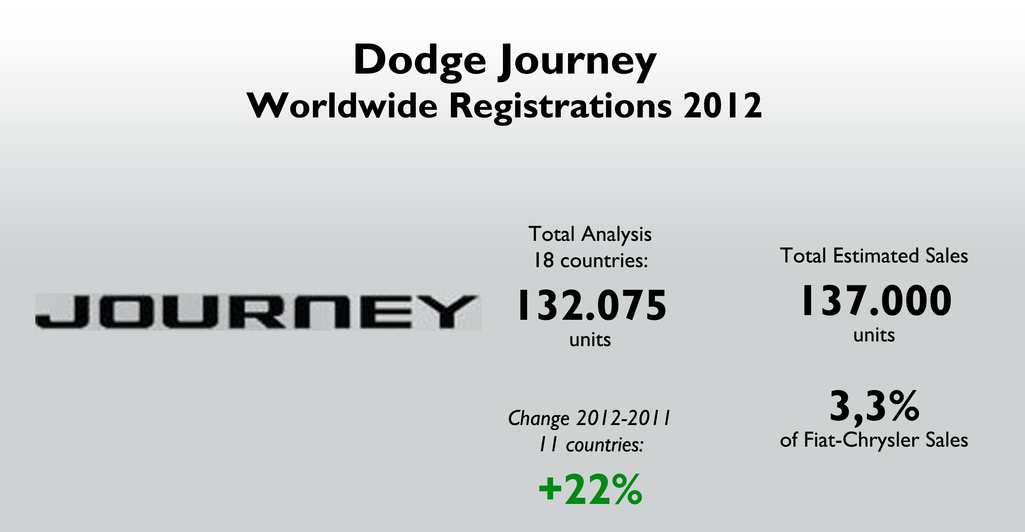 The analysis includes data for 18 countries. There is information about 2012/2011 change for only 11 countries, and there the Journey’s registrations advanced 22%. This nameplate counts for 3,3% of Fiat-Chrysler total sales. Source: see at the bottom of this post.