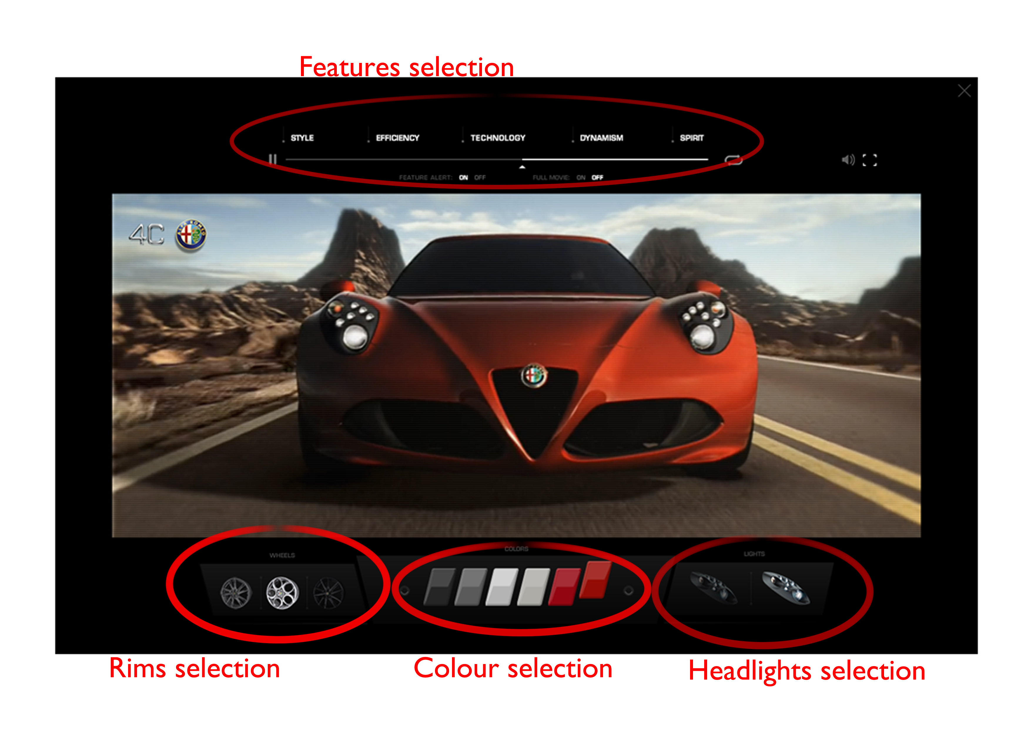 That’s why they brought to life the video car configurator.Ā It allows the user to interact with the car in motion, and change the colours, rims, and headlights. As the car moves in a road in American desert, the user can check the detail features regarding the style, dynamism, efficiency, technology, and the spirit of one of the best Alfa of the last years. By this way, anyone can appreciate the extraordinary shapes of the car, and at the same time, learn about its awesome characteristics. It is also possible to save the configuration or share it in Facebook. If the user wants further information he can go to the 360 Customizer, where the supercar can be seen from different angles. In this section, there is the possibility to see the different brake calipers options, the spoiler, and tailpipes. There is also a dedicated section for the different videos regarding the 4C, and the roadshow map, that shows the places where this Alfa Romeo has shined already. Alfa made it: they launched one of the hottest cars on the market, and they propose an interesting interactive way to get familiar with it.