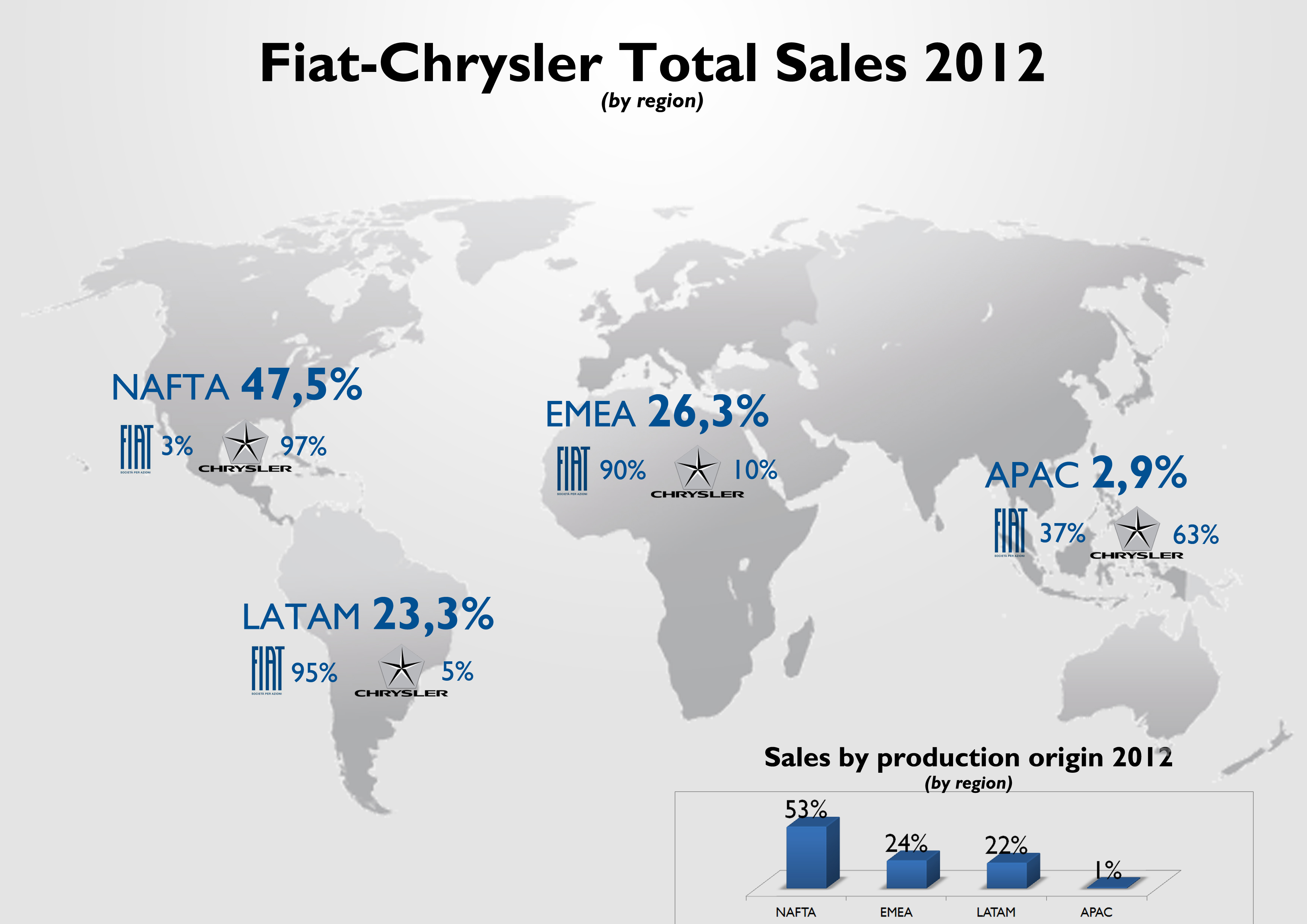 * based on the collected data from several sources. ** Includes Fiat Professional and Abarth sales. Fiat-Chrysler's official report for 2012 results indicates that the company sold more than 4,2 million units in 2012. Fiat brand counts for a big part of the sales and is ahead of any other Chrysler brand. Nevertheless the sales are mostly concentrated in North America. Asia-Pacific is still a very small market for the group. Source: see at the bottom of this post.