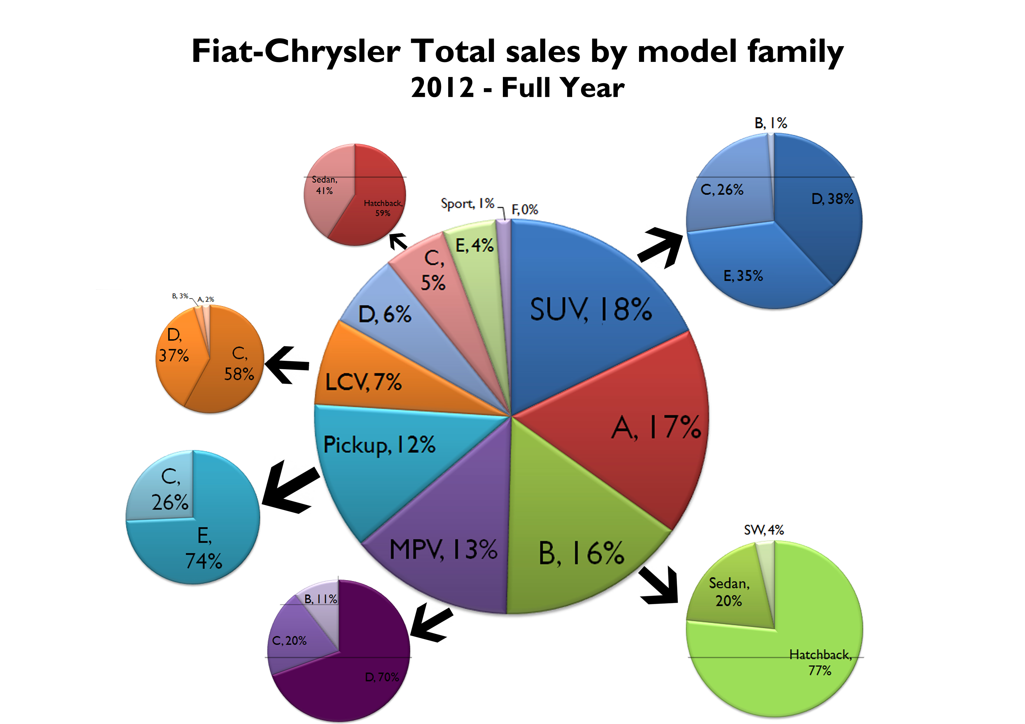 18% of Fiat-Chrysler sales in 2012 were SUVs. That's more than total sales of A-Segment cars. Notice that the group sells more Pickups and LCV cars than C-segment cars. That should change as Europe and China love C-segment cars. Source: see at the bottom of this post.