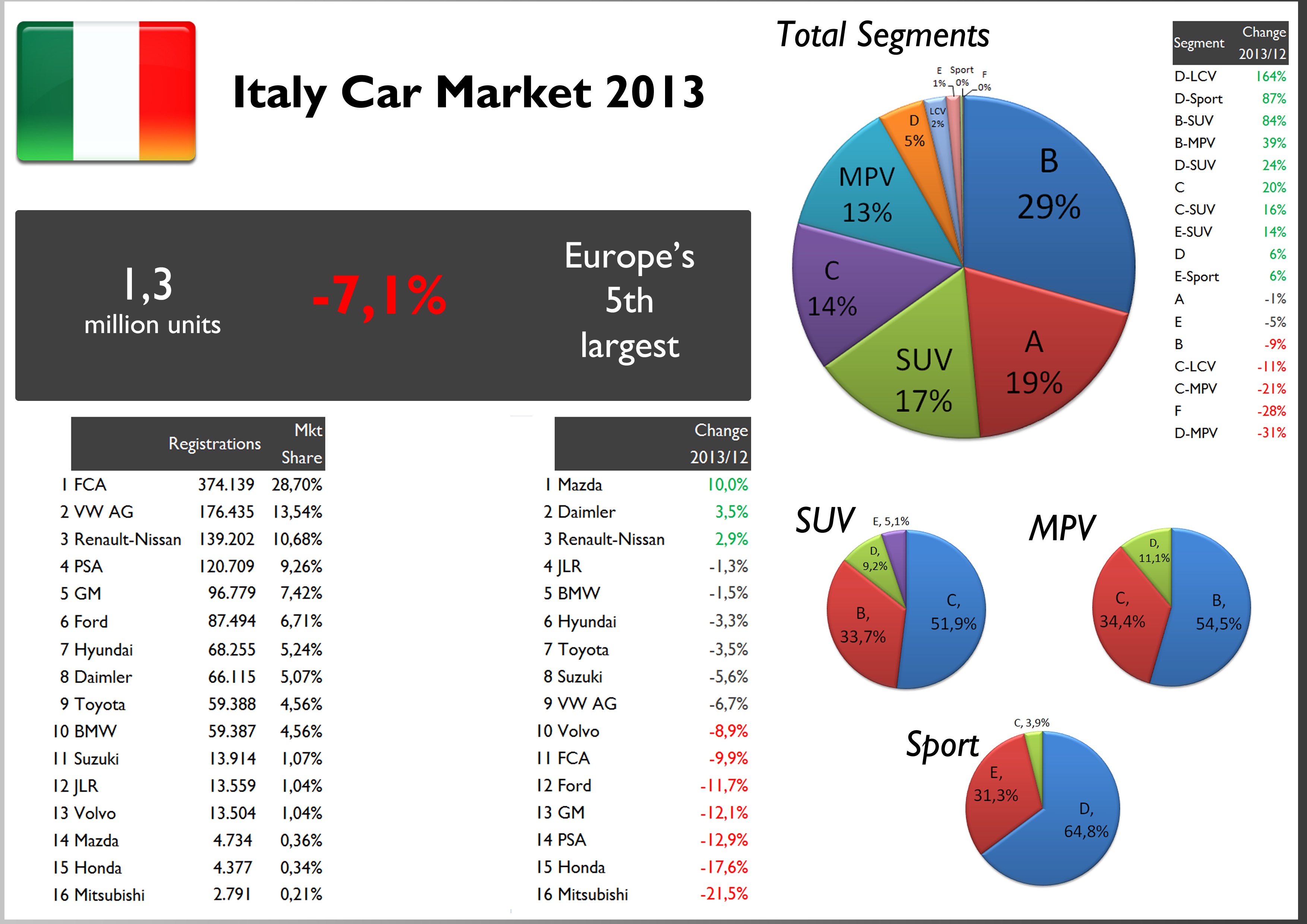 - Italians prefer small cars as almost 50% of the market correspond to city cars and B-segment hatchs. However, SUVs continued to gain share thanks to the small ones. As it happened in France, Italian consumer is shifting from regular B-Segment to B-SUV. MPVs surged thanks exclusively to the Fiat 500L, but it is a segment that loses share.