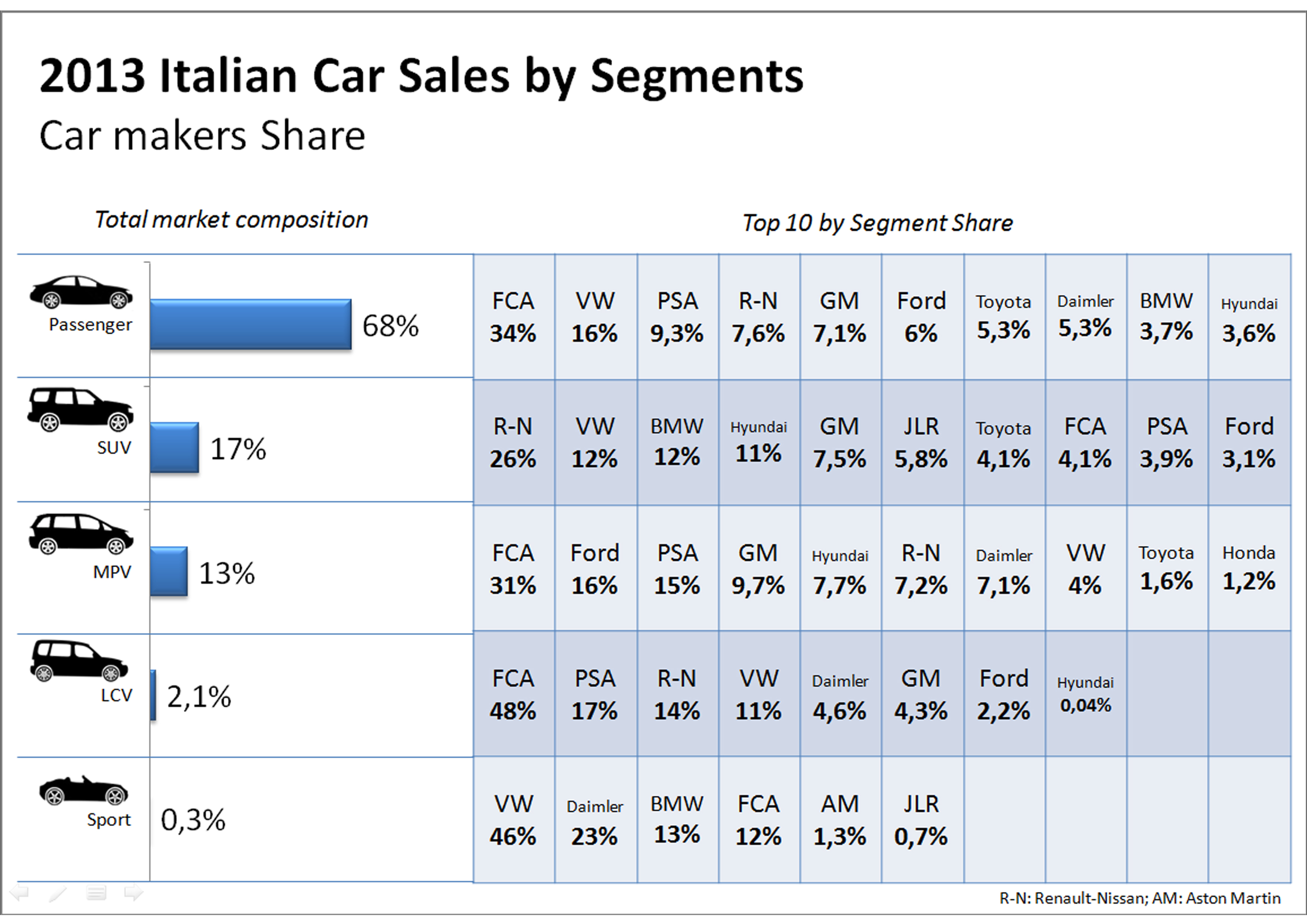 - FCA rules with an important advantage. Nevertheless, its share fell and is still far from Renault/PSA in France and VW in Germany. Ford, GM and PSA are the biggest losers of 2013.