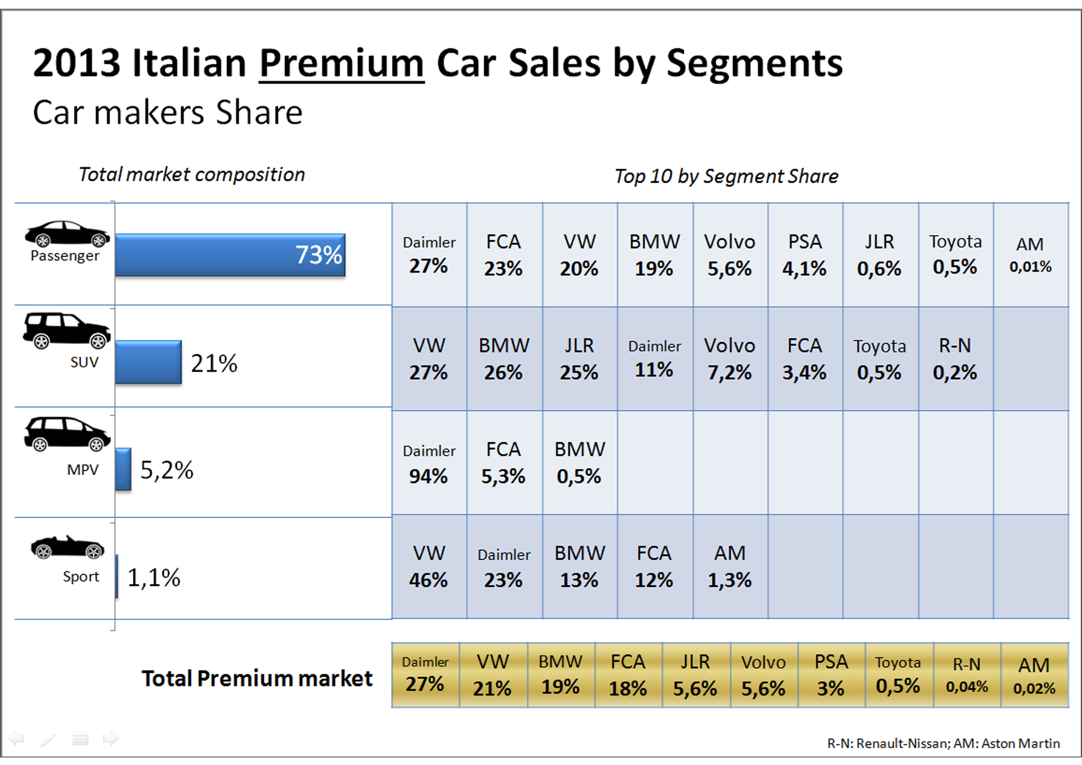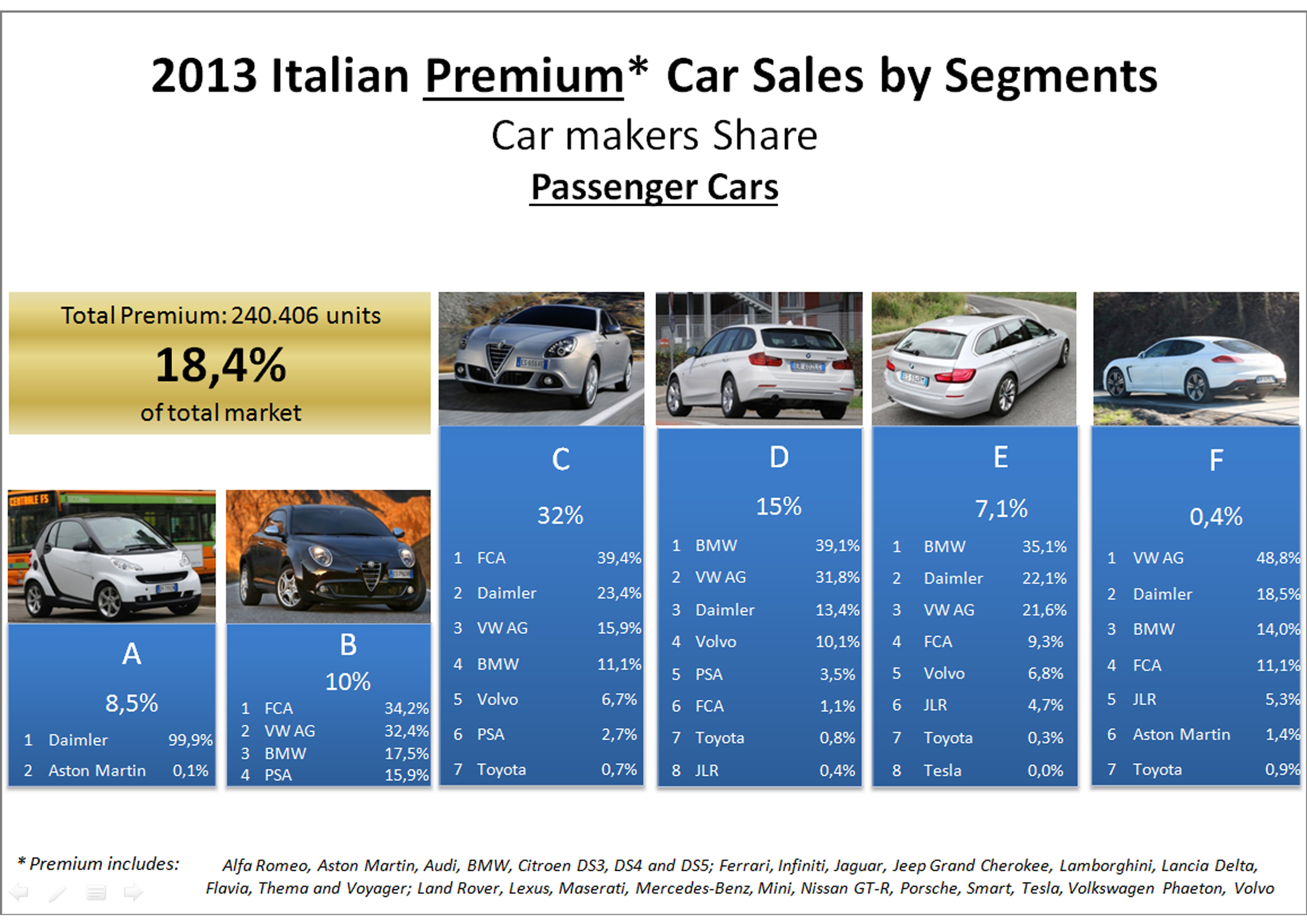 - Premium segment counted for 18% of total market. That’s not bad considering the high prices of this kind of cars. Of course the Germans lead in the upper segments, despite FCA try with Maserati.