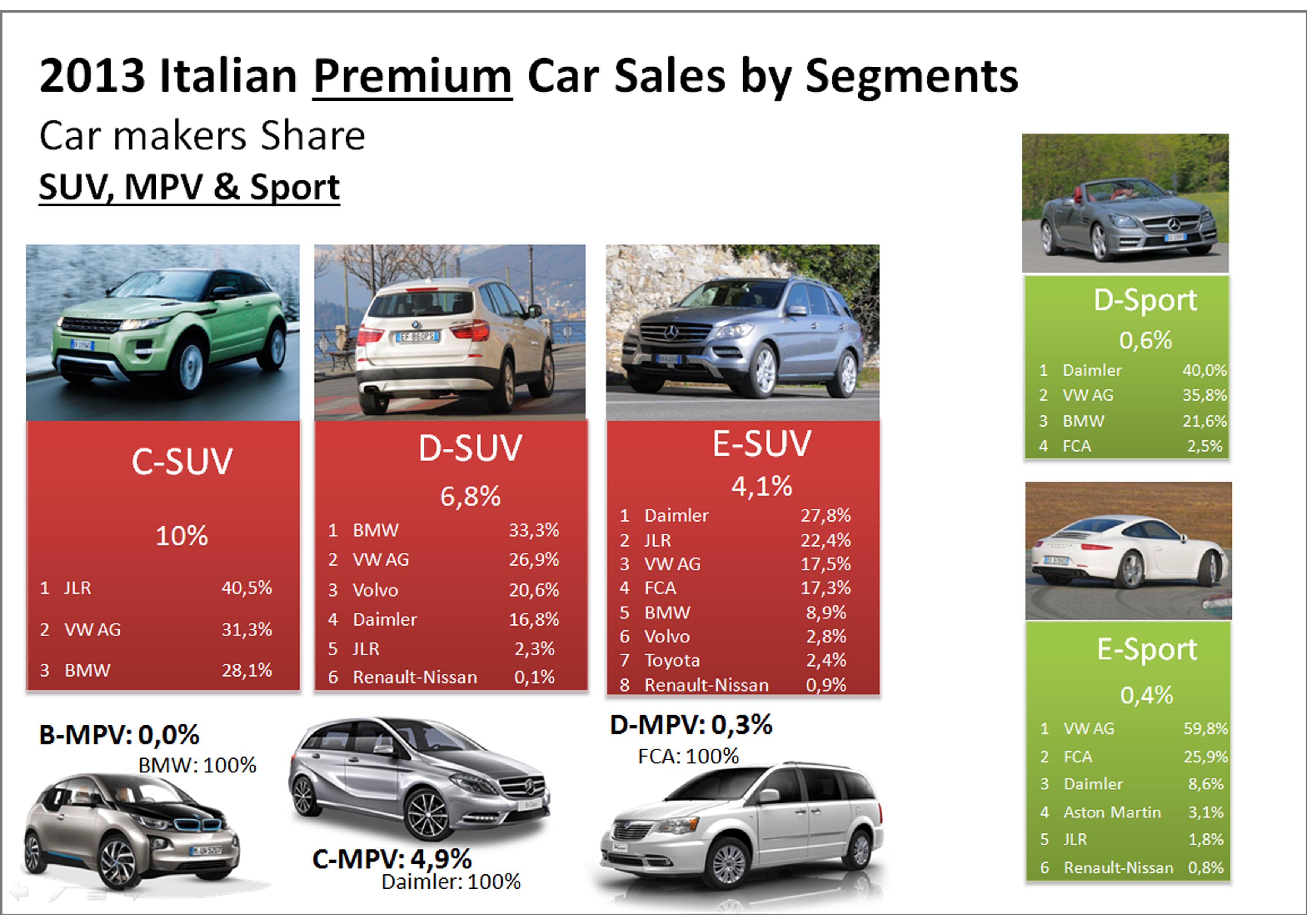 - German premiums control the upper SUV segment but FCA has an important share in E-SUV thanks to the Grand Cherokee, the second best-selling large SUV in Italy in 2013.