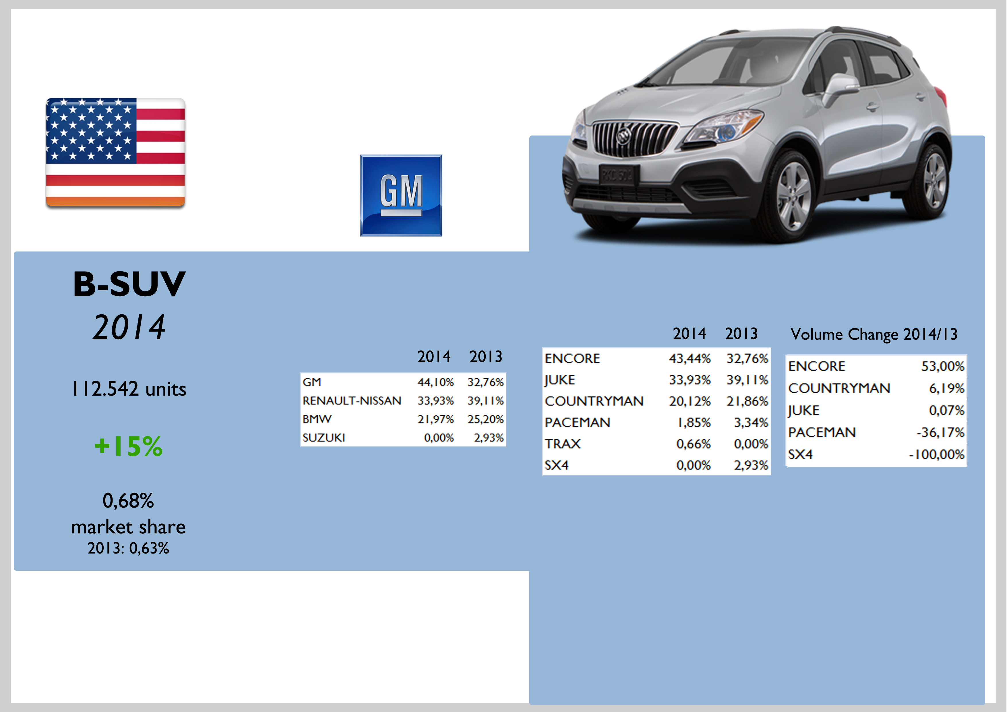 - This is because of the few offer with only 6 different options. The Buick Encore (aka Opel Mokka) leads this segment. This year the Jeep Renegade and the Fiat 500X will join it.