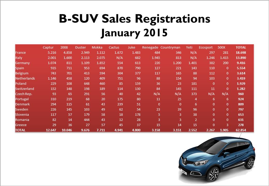 European small SUV segment posted a positive growth of 30% on January 2015 outperforming overall market by far. While total market was up a tiny 6%, B-SUV sales continued on its positive trend thanks to new launches and demand shift. More than 81.000 small SUVs were sold in Austria, Belgium, Cyprus, Czech Republic, Denmark, Estonia, Finland, France, Germany, Great Britain, Greece, Hungary, Iceland, Ireland, Italy, Latvia, Lithuania, Luxembourg, Netherlands, Norway, Poland, Portugal, Romania, Slovakia, Slovenia, Spain, Sweden and Switzerland. Market share jumped from 6,47% in Jan/14 to 7,89% one year later, based on JATO Dynamics information. The main contributors to this result are the new launches such as the Citroen C4 Cactus, Jeep Renegade, Ford Ecosport and Fiat 500X. The usual leaders of the segment, Renault Captur, Peugeot 2008, Opel Mokka and Dacia Duster, had a double-digit growth (around 20%) except for the Peugeot, up 8%. The Nissan Juke and the Mini Countryman had the worst results with sales up 2% for the Nissan and down a massive 30% for the Mini.