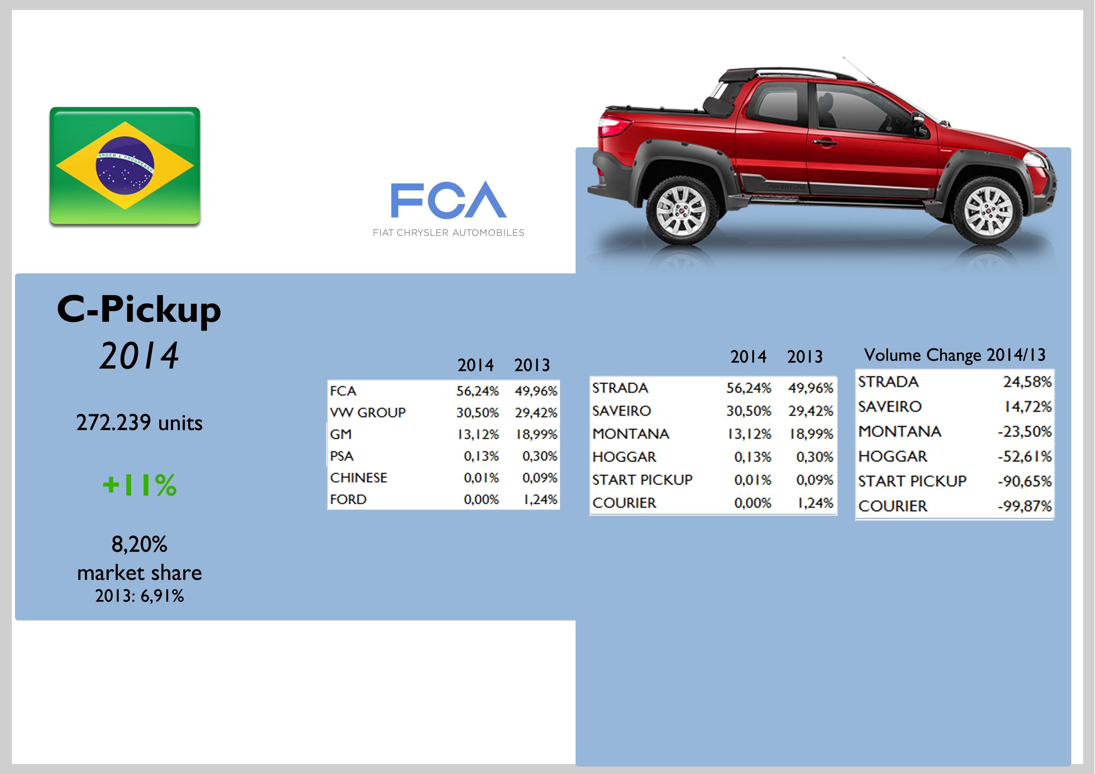 - Once again the Fiat Strada is the favorite small truck in Brazil. The updated version, launched in the first semester of 2014, gave this Fiat even more power to increase its share in a segment whose sales are up 11%.