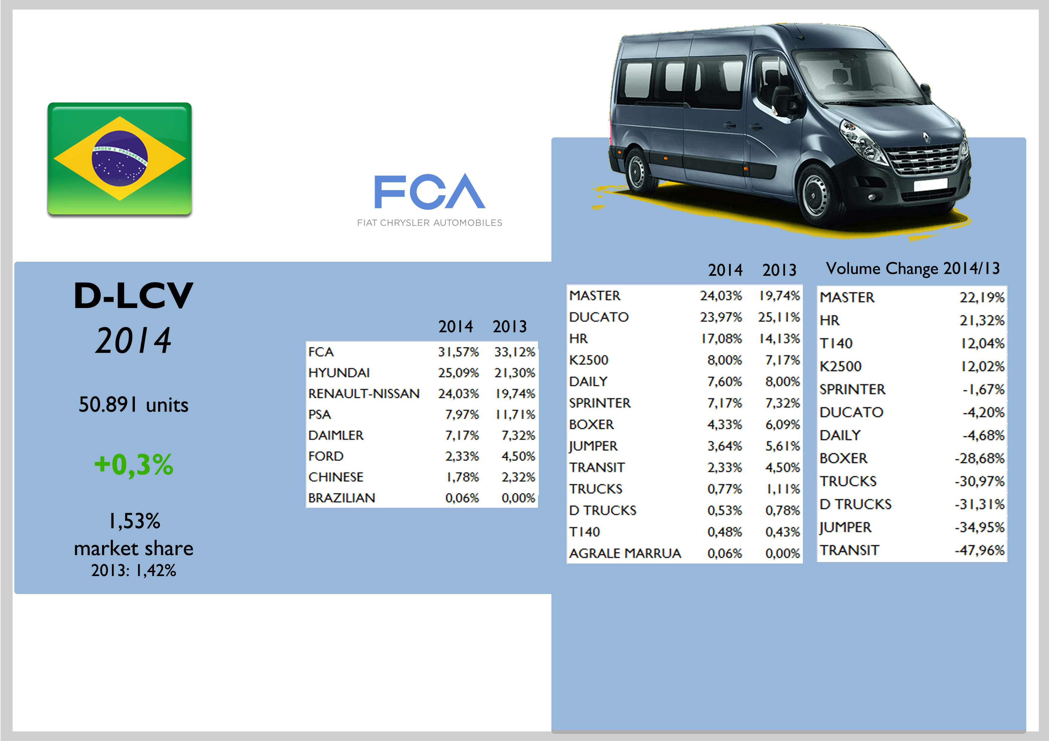 - Total market change outperformed FCA’s, but the Italians are still the best-selling car maker in Brazil. The group lost 0,4 basis points of market share due mostly to the increasing demand for the Hyundai HB20S and Toyota Etios.