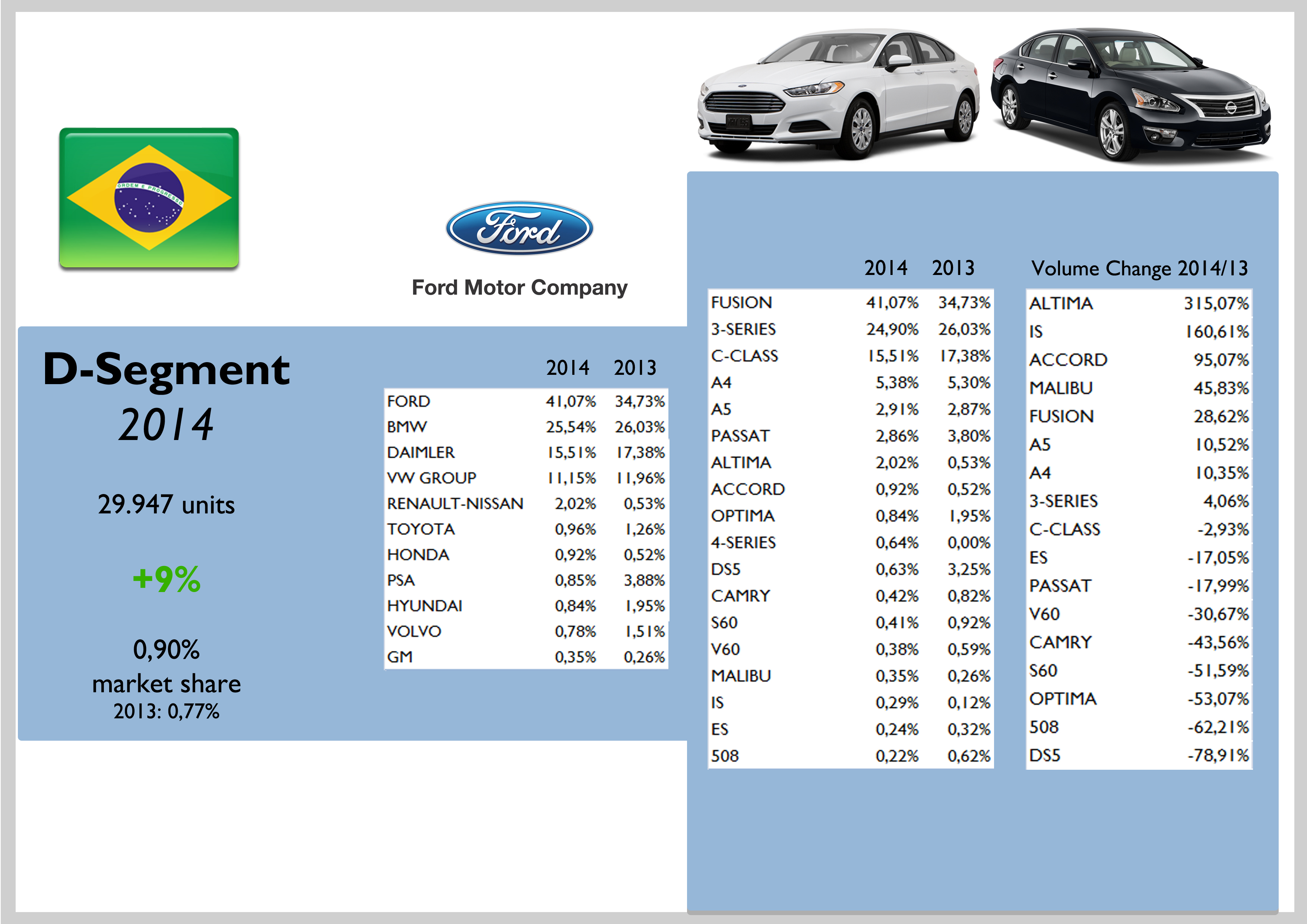 - The Ford Mondeo is the absolute leader of the segment. Thanks to the new generation (it is imported from Mexico), Ford was able to rise its share within the segment from 35% to 41% in only year. However in terms of growth, the Nissan Altima and Honda Accord posted the largest increase. The Germans didn’t have important changes.