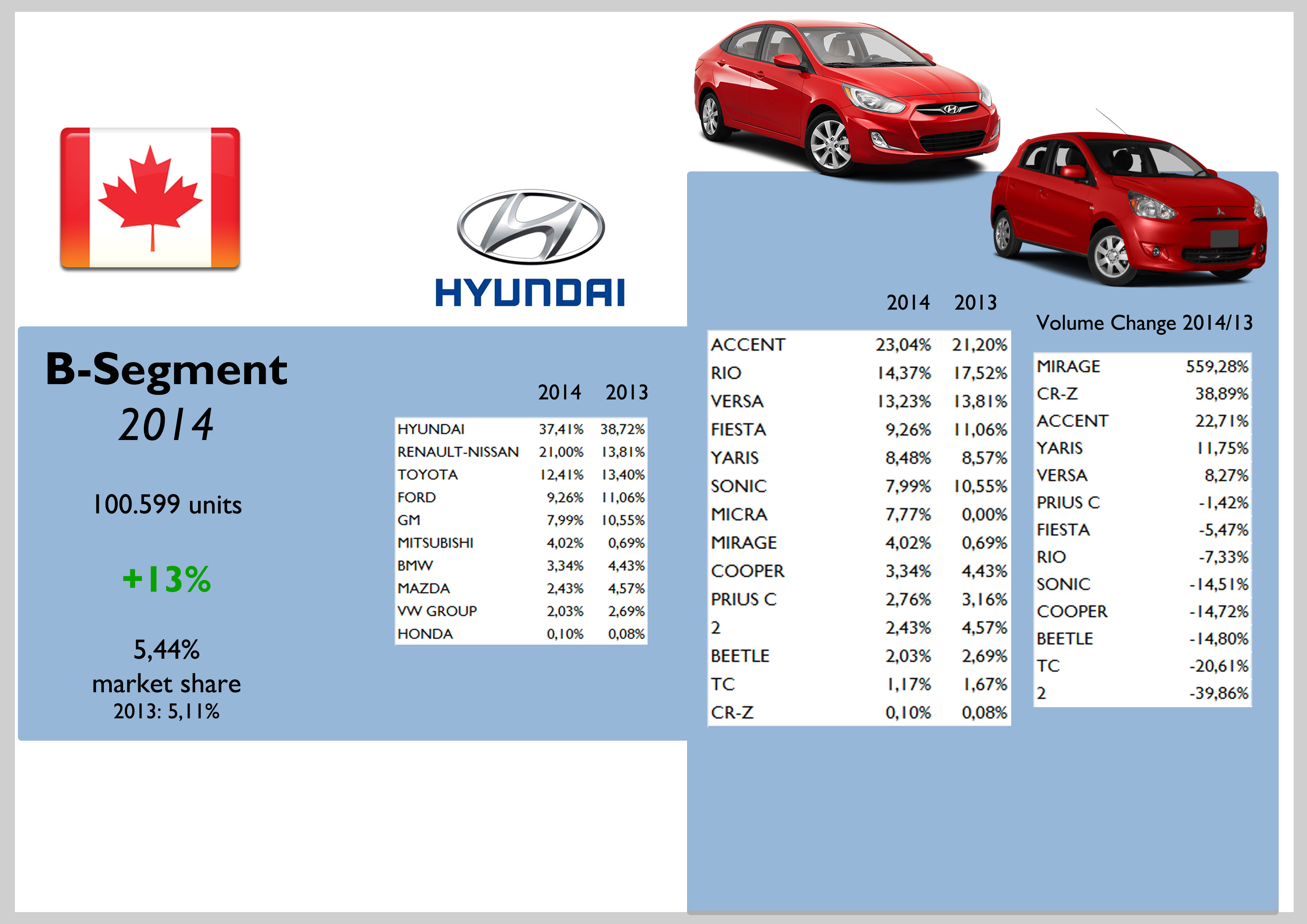 - Sub-compact cars totalled more than 100.000 units in 2014. Hyundai continues to lead but this time Nissan reduced the gap. Nissan was the only big brand to increase its registrations.