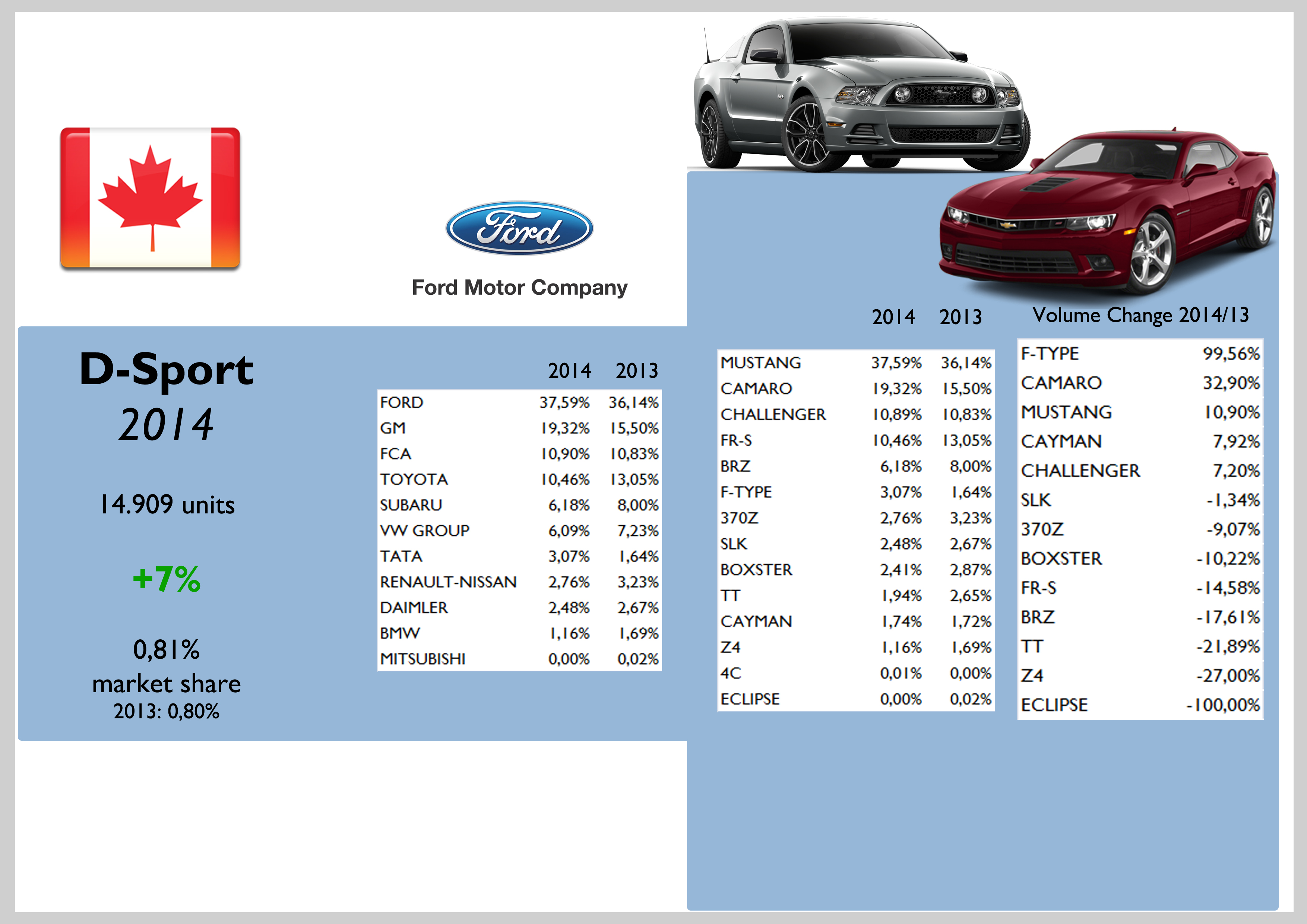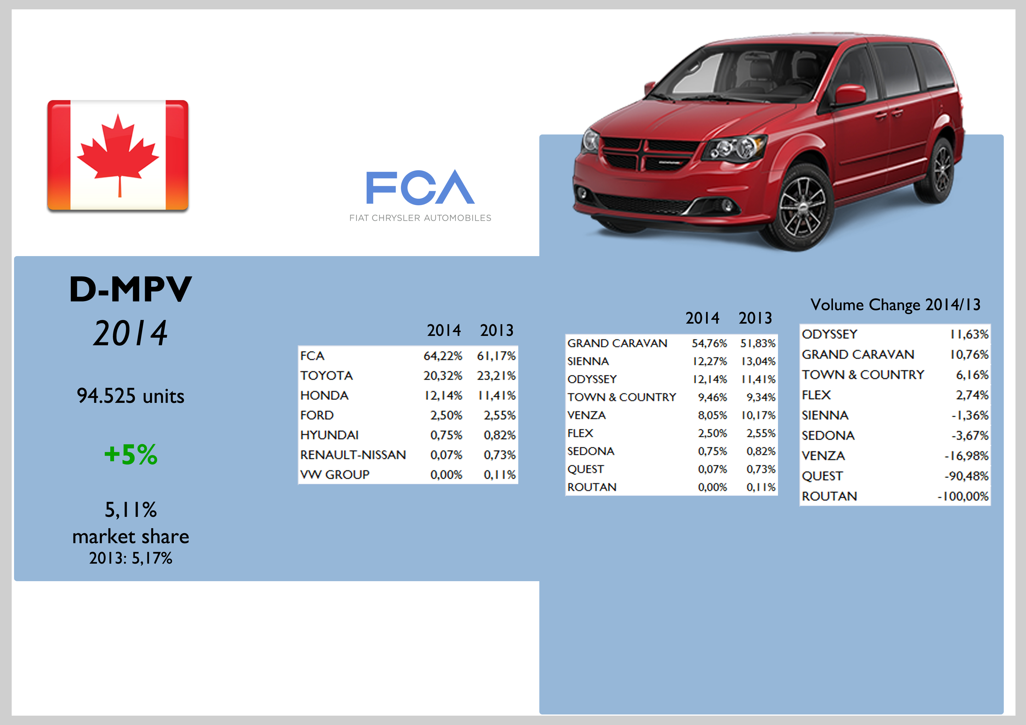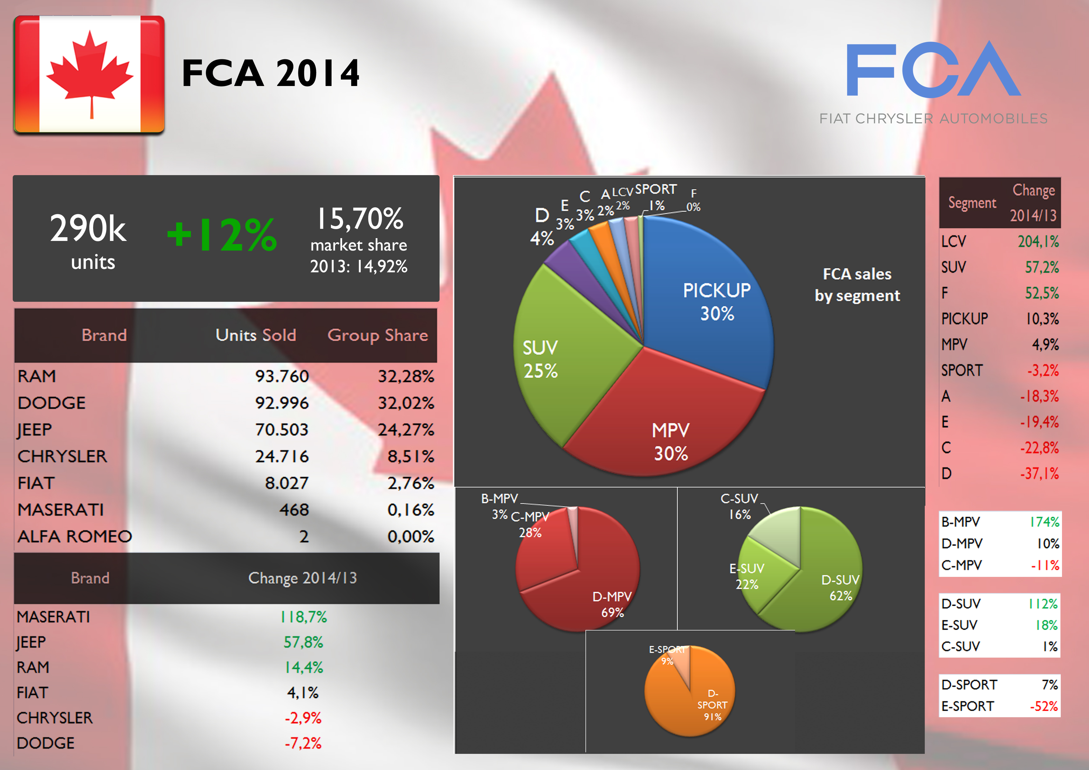 Things went very good for FCA in Canada in 2014. The group almost dethroned Ford as the best-selling carmaker thanks to its very good performance. FCA brands’ registrations doubled the overall market’s with excellent results coming from Jeep (+58%), Ram (+14%) and Maserati. Total market sales went up a healthy 6% to 1,85 million units, mainly SUVs and compact cars. The growth came mostly from the SUVs and sub-compact cars. Contrary to the general trend, FCA occupied the second position in the ranking thanks to its Ram Pickups, its minivans (built-in Canada) and its Jeep SUVs. It is very weak in the C-Segment.
