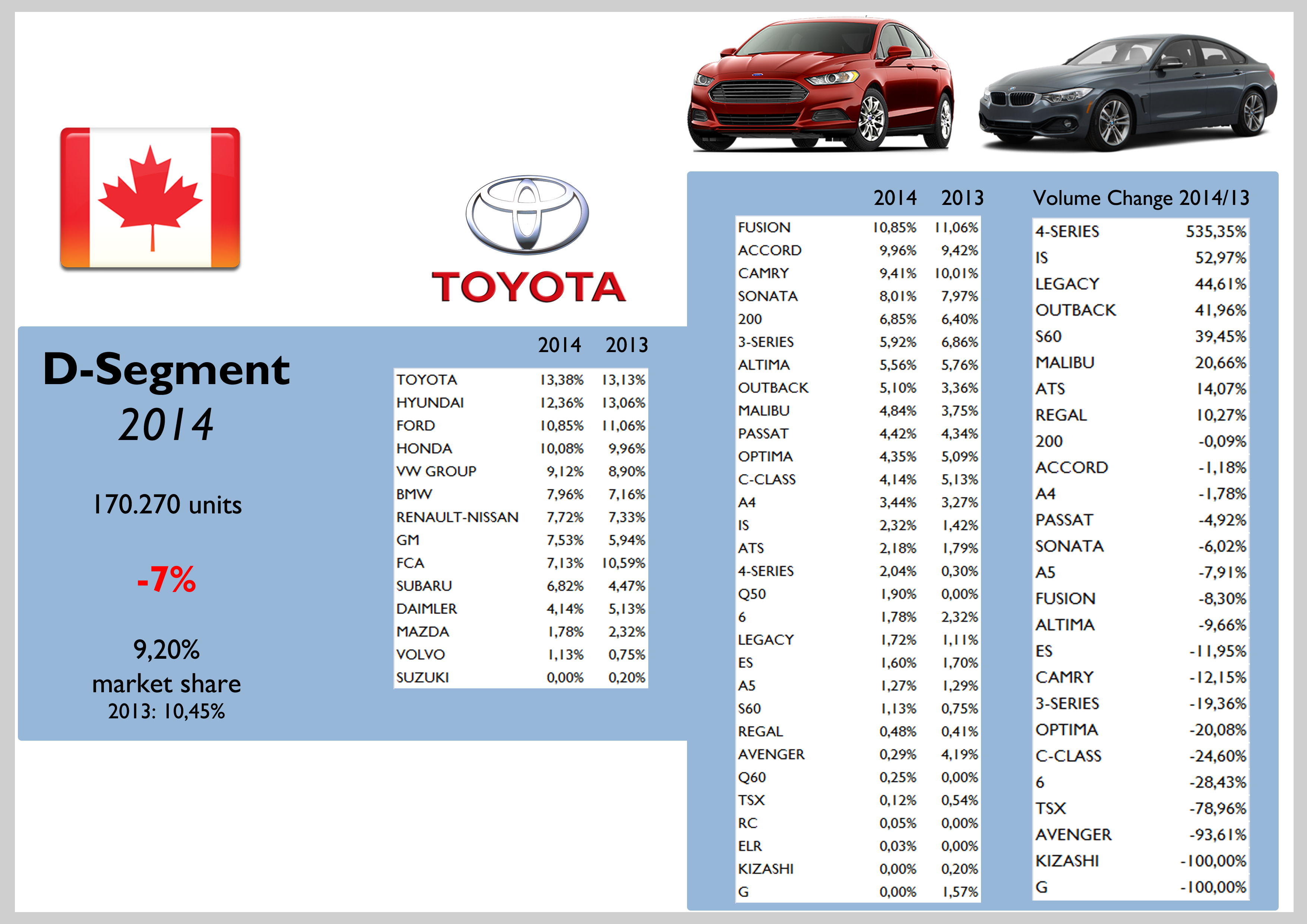 - Compact SUVs is the third most popular single segment in Canada, after the C-Segment and large pickups. Last year sales jumped a massive 16% allowing to increasing its market share by more than 1 basis point.