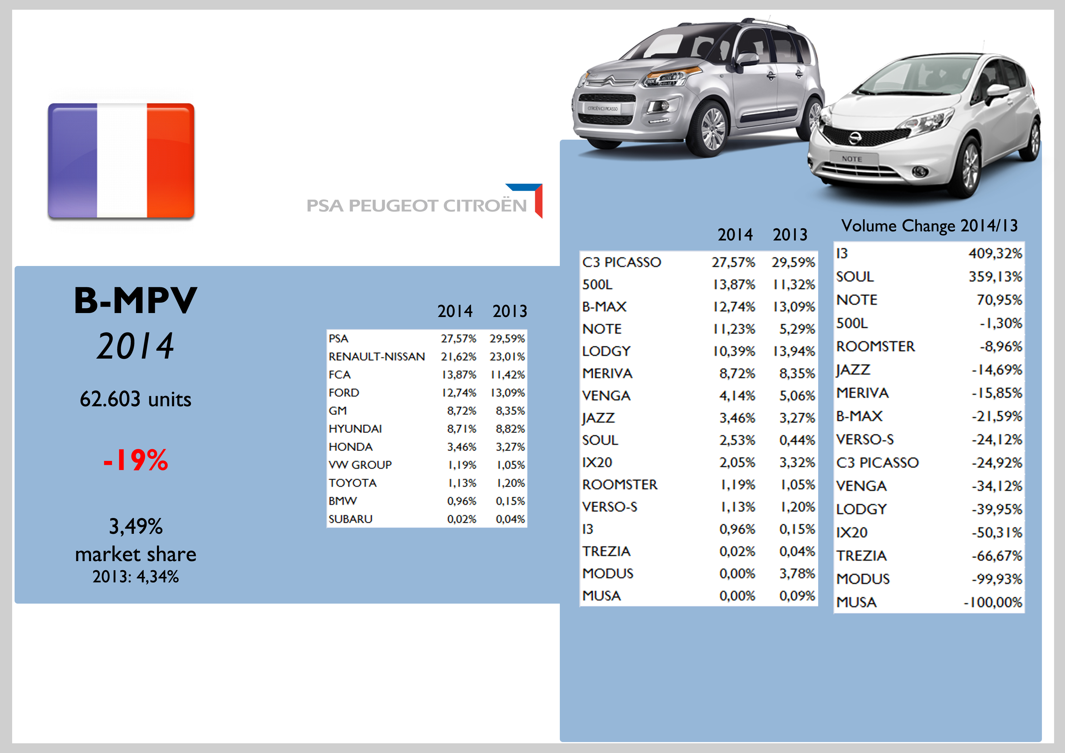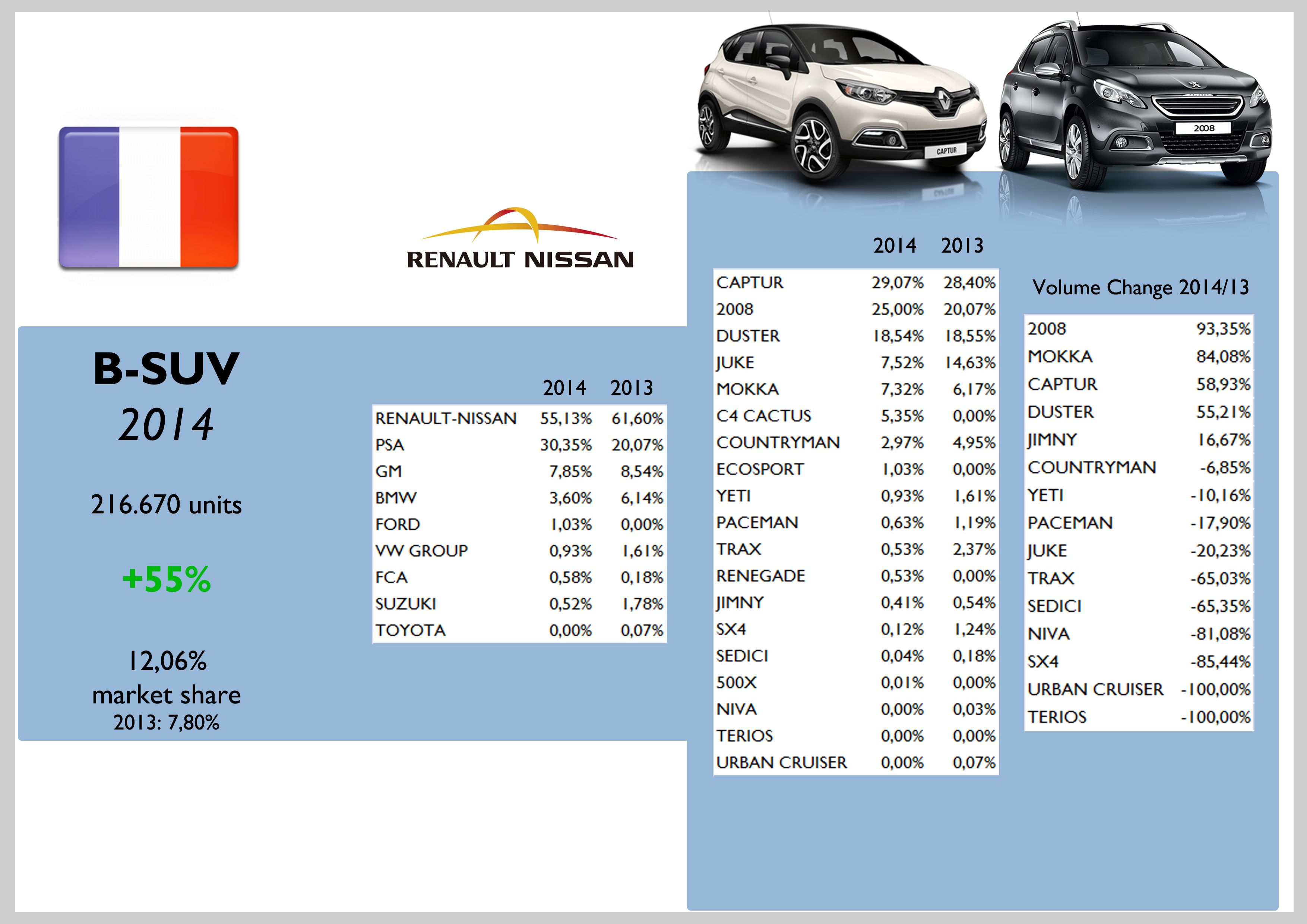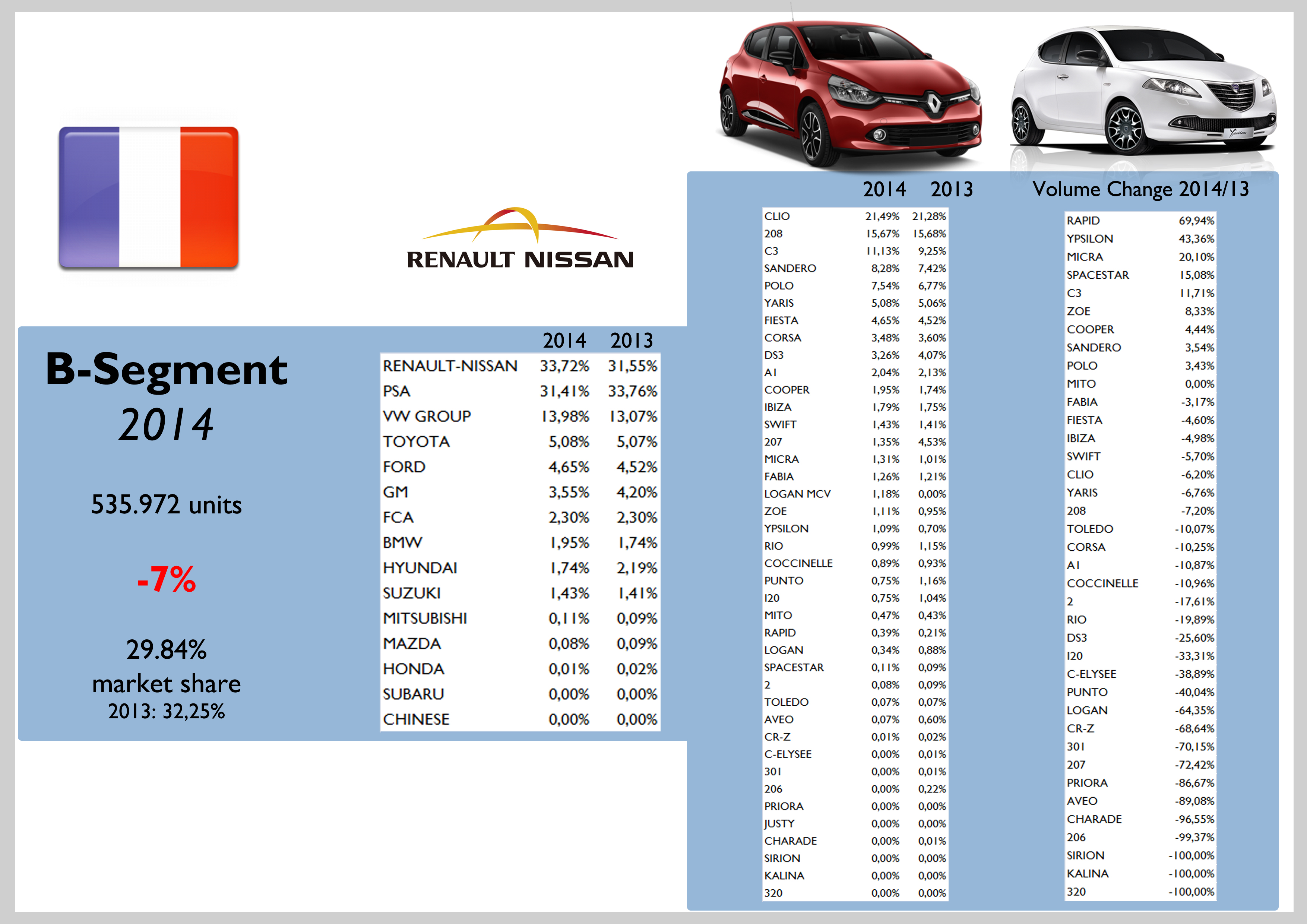 Last year passenger car sales remained stable in France, with the 2 local car makers increasing their share up to 59% of total market. As it is happening in other European markets, SUVs continue to gain share while city-cars and subcompact cars (A and B segments) registered falls in their demand. The B-SUV (+55%) had a direct impact on the registrations of those segments. FCA along BMW and Daimler, were the only big foreign car makers to post positive growths during 2014. VW Group, Ford, GM, Toyota and Hyundai lost market share. FCA sold 63.000 cars, up a tiny 1,2% thanks to the great job of Jeep brand and Lancia (France was perhaps the only market where its sales went up). Due to the success of the Maserati Ghibli (in terms of demand growth) and the Jeep range, the segments within the group to post the best results were the E and SUV ones. Anyway total sales continue to rely on the city-cars (almost half of the total). The 500 counted for a big 35% of FCA’s sales in France. The Lancia Ypsilon demand advanced an incredible 43% outselling the Fiat Punto and the Alfa Romeo Giulietta. The Jeep Renegade occupied the 8th position in FCA’s ranking by model.