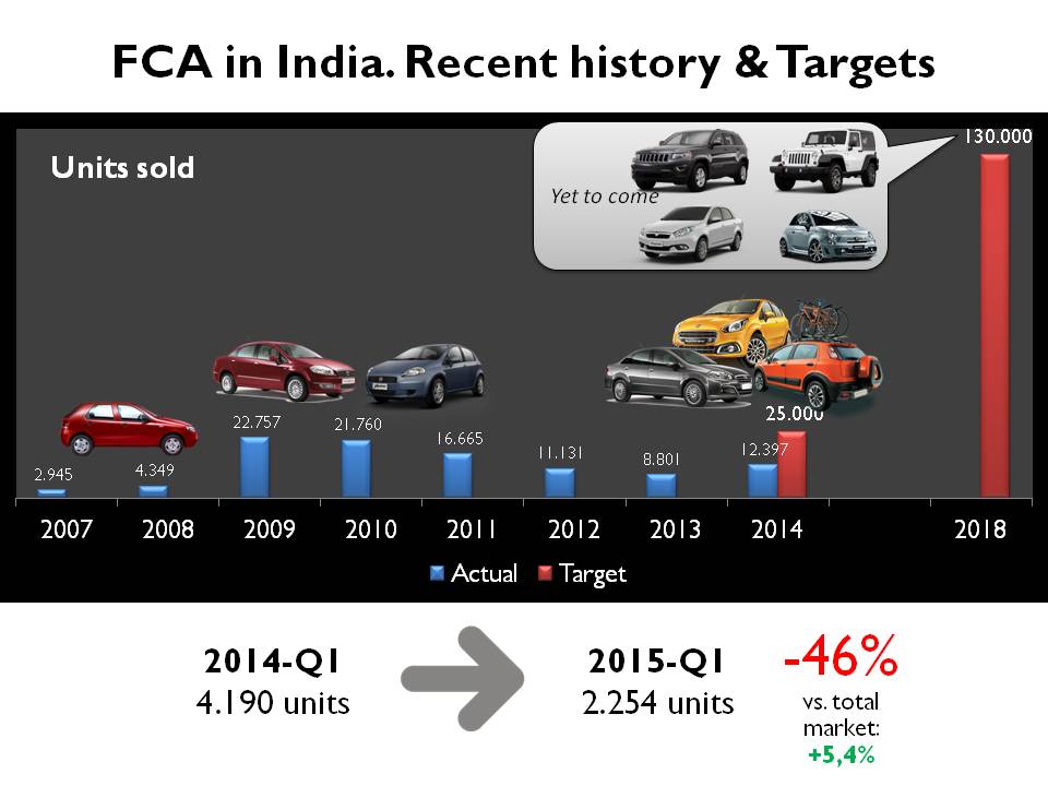 Sub-compact car sales in IndiaIn May 2014 at the Investor Day presentation, the company indicated that it intends to sell 130.000 units by 2018 thanks to Fiat and Jeep brands, which is supposed to be introduced this year. By that year the group aims to produce 6 models, import other 2, and selling all of them in 220 dealers. FCA targets are based on IHS projections for overall market of 5,1 million units in 2018, including LCVs. During that presentation the company also showed its 2014 FY target: 25.000 units. As stated before Fiat total sales were below that objective and the brand could only achieve half of it. The main problem is the reduced range despite the launch of other versions such as the Avventura (the cross-over look of the Punto), a revamped Punto and the upgraded Linea. At the end all of them are mere updates which feature better trims and in some cases better engines. But the market expects more: more products and all-new cars, and that’s what the competitors are doing.