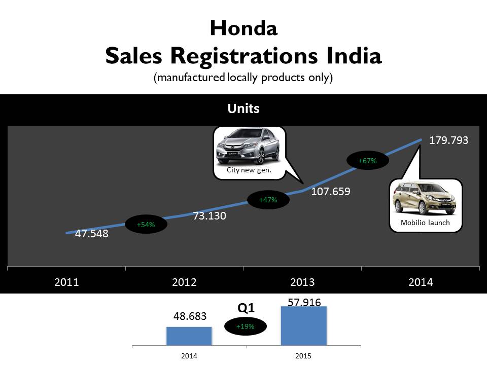 The Japanese car maker delivered 180.000 units in 2014, up a massive 67%. In 2011 they sold 48.000 cars. The product strategy is based on developing a family of cars specially designed to meet Indian taste and needs, and becoming a referent in the C-segment with the modern Honda City sedan. Contrary to Renault and Nissan, Honda’s growth isn’t based on a particular SUV (the HR-V is expected to hit Indian dealers shortly). They just focus on giving Indian consumer what he’s looking for: modern cars that meet local tastes.